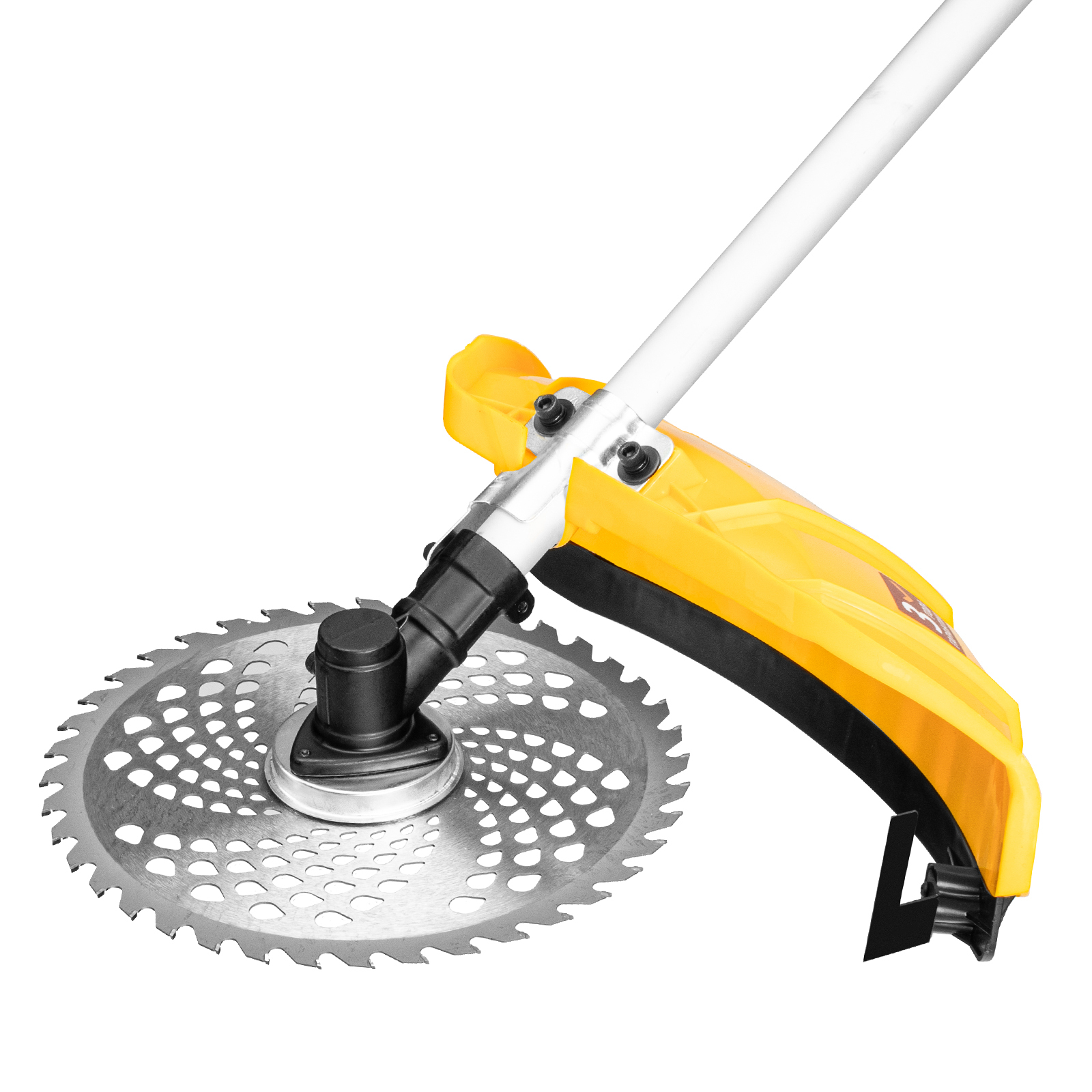 - Ограничительный нож — лезвие на пластиковом кожухе автоматически обрезает лишнюю леску, что обеспечивает защиту двигателя от повышенной нагрузки и перегрева.