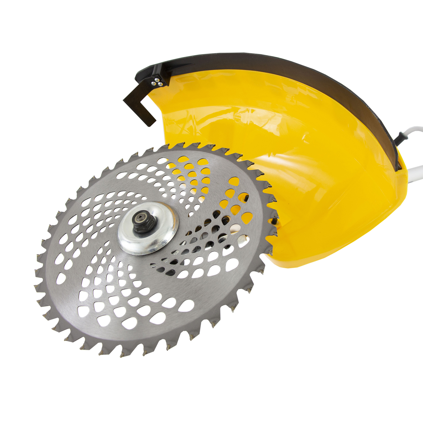 - Дополнительные возможности — можно приобрести и установить на триммер диски Denzel 96323, 96325 для быстрого удаления растительности с жесткими стеблями (полыни, крапивы, лебеды), 96328 для скашивания молодых побегов кустарника диаметром до 3 мм.