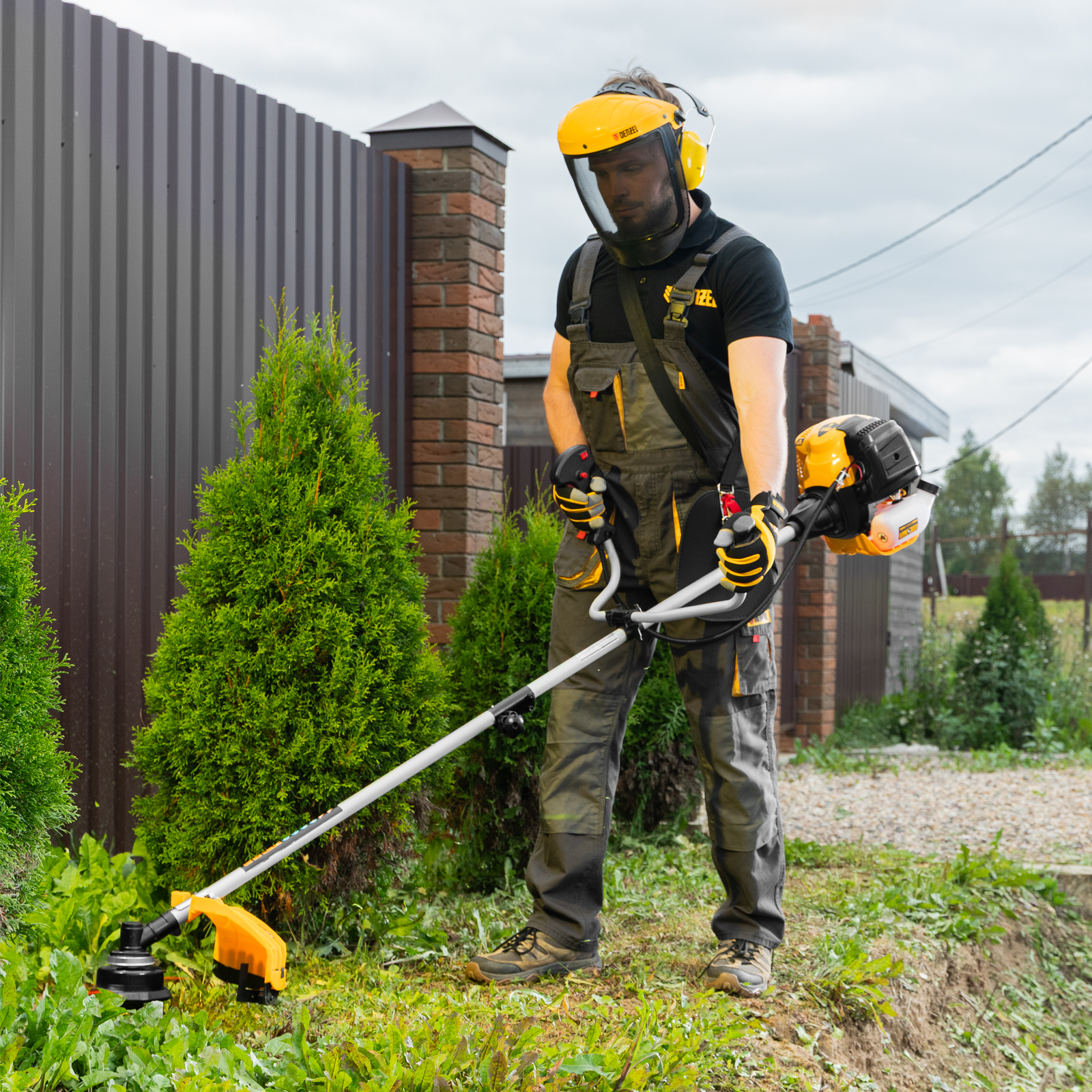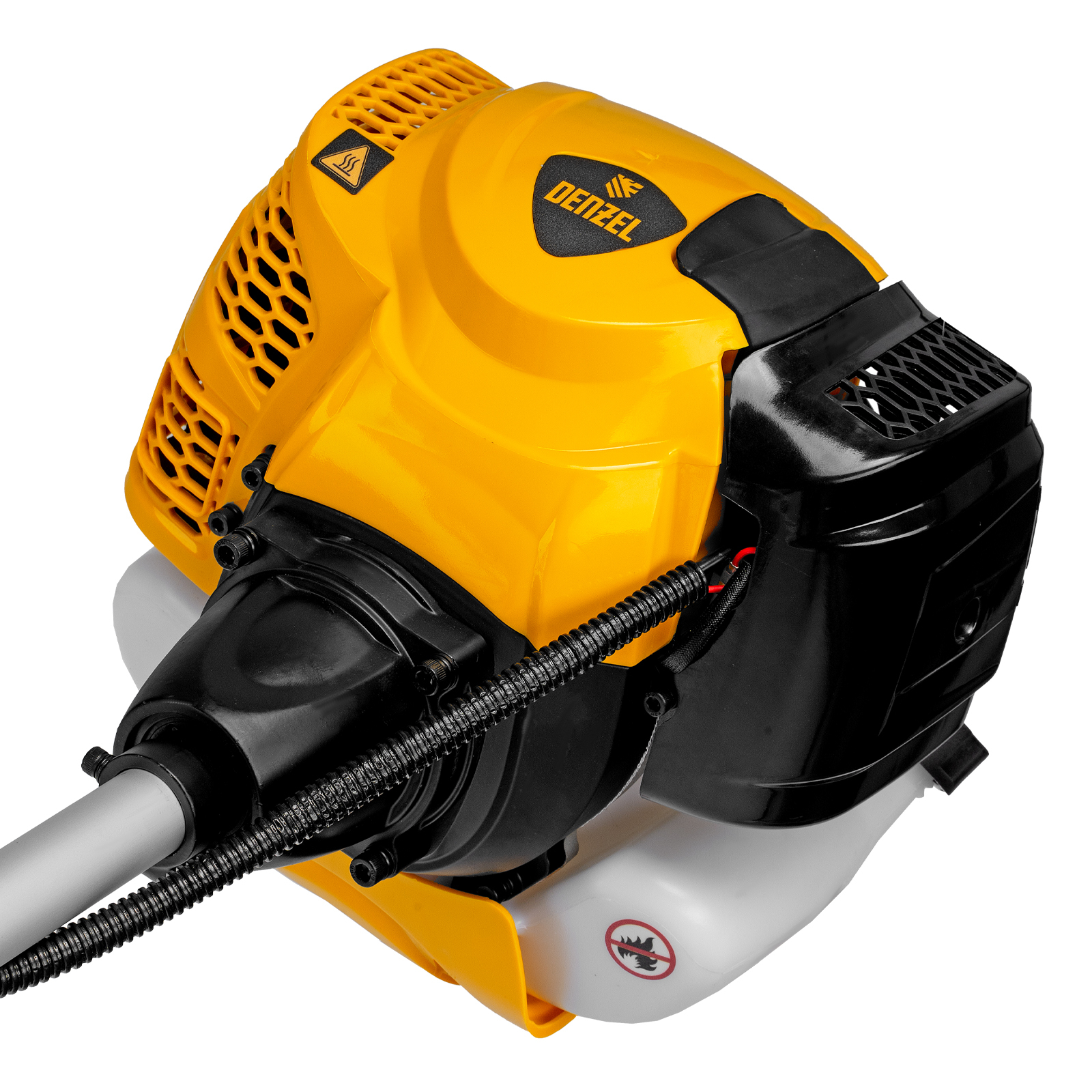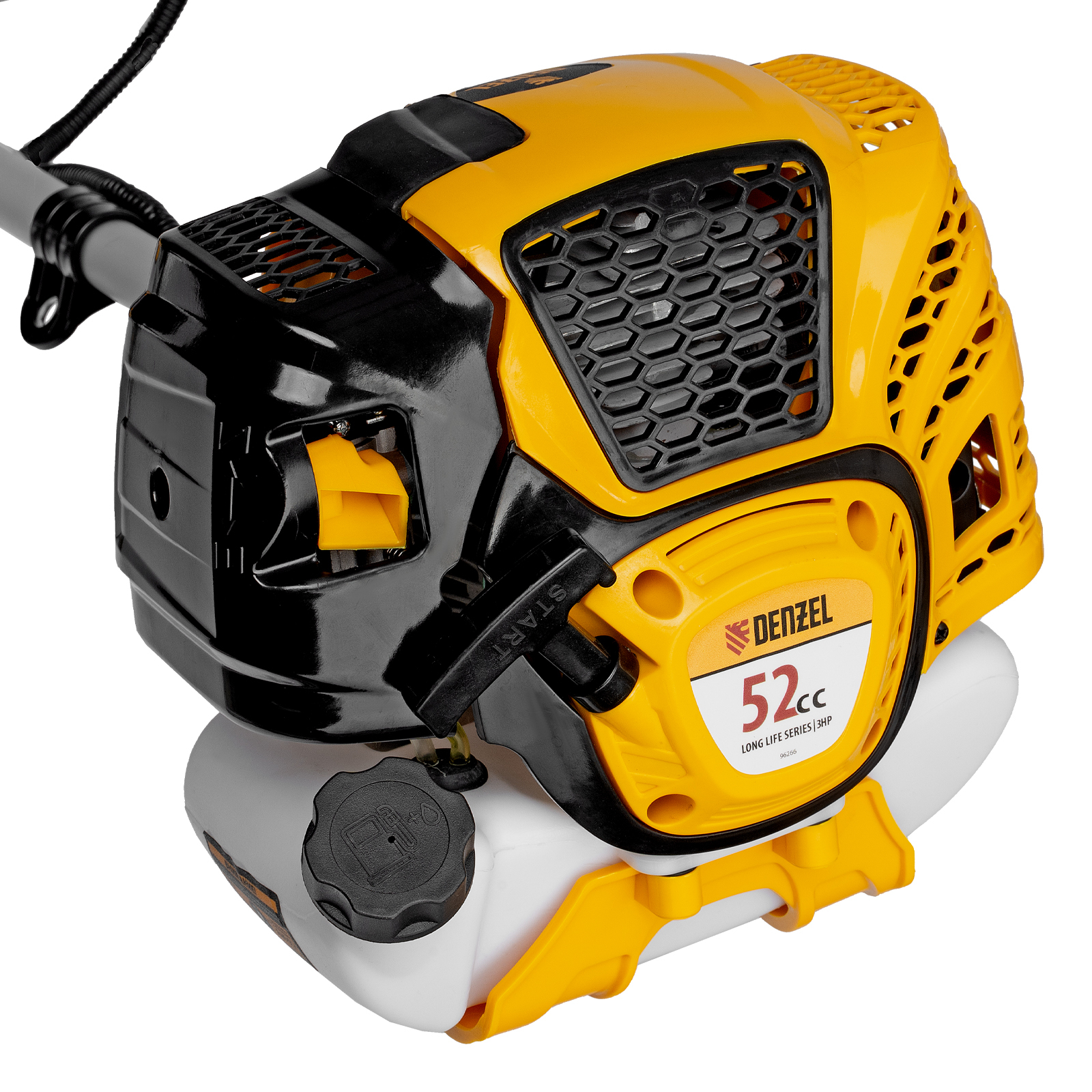Бензиновый триммер Denzel DTL-52S 96266 с разъемной штангой, состоящей из 2 частей, оснащен 2-тактным двигателем объемом 52 см3 и предназначен для стрижки газона, скашивания травы всех типов, в том числе с жесткими древовидными стеблями (полыни, крапивы, лебеды, борщевика), а также срезания кустарника и молодых побегов деревьев с диаметром стволов до 10 мм. Усиленная катушка с леской и пильный диск обеспечивают ширину скашивания 42 и 25,5 см. Инструмент не требует подключения к электросети, поэтому подходит для работы с влажной травой и может использоваться на отдаленных от дома участках.