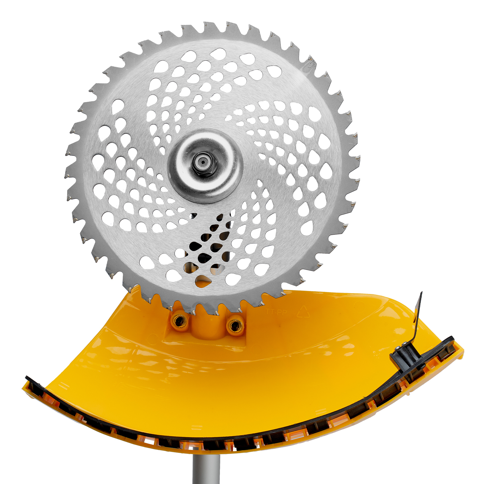 - Дополнительные возможности — можно приобрести и установить на триммер диски Denzel 96323, 96325 для быстрого удаления растительности с жесткими стеблями (полыни, крапивы, лебеды), 96328 для скашивания молодых побегов кустарника диаметром до 3 мм.