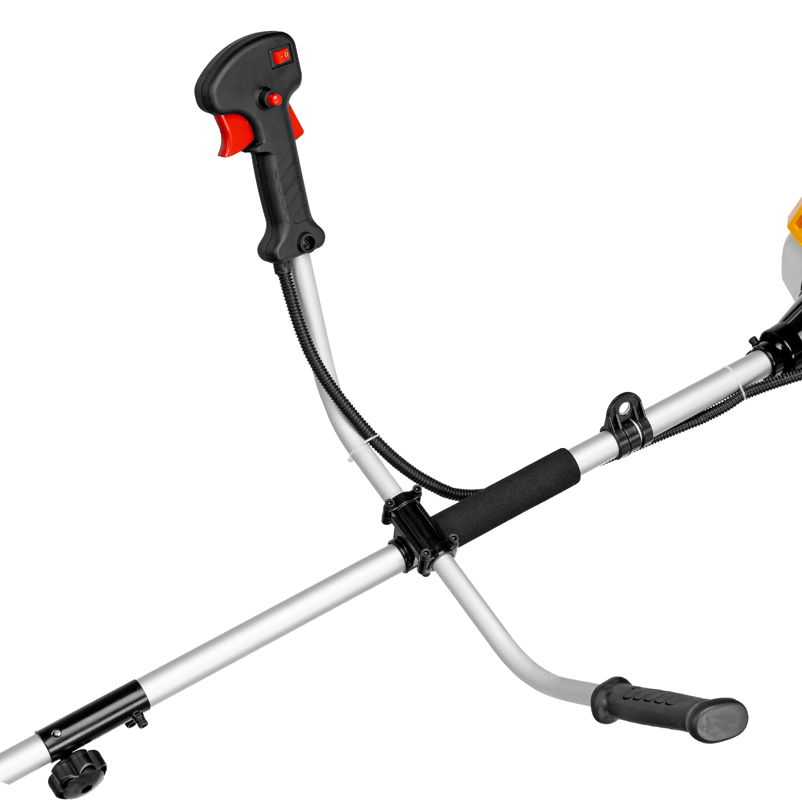 - Эргономичность — велосипедная рукоятка имеет асимметричную форму, поэтому триммер удобно удерживать и направлять.