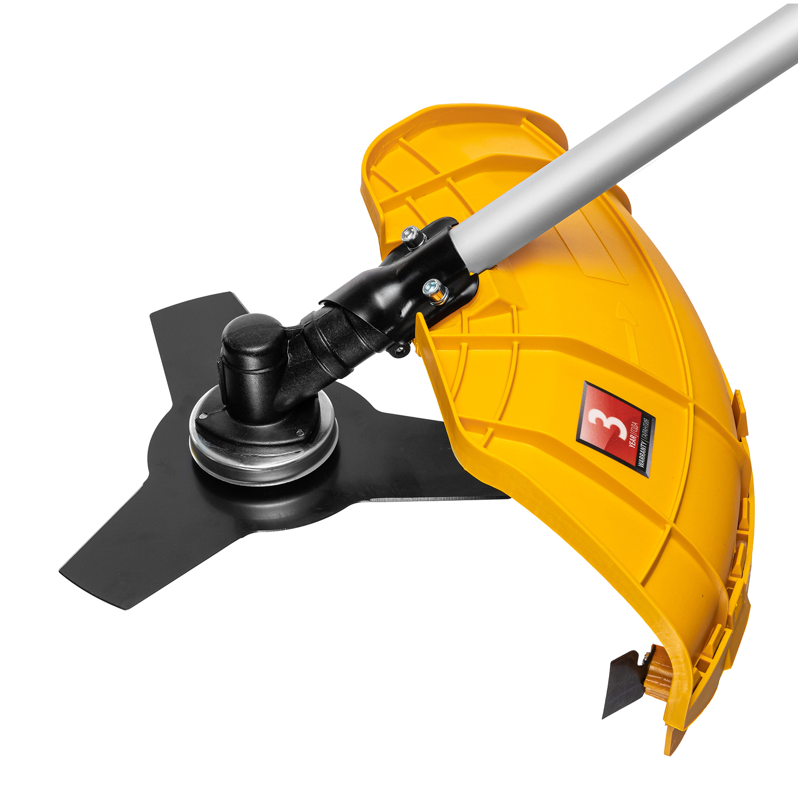 - Дополнительные возможности — можно приобрести диск Denzel 96323 с шириной скашивания 230 мм для быстрого удаления растительности с жесткими стеблями, 96328 для скашивания молодых побегов кустарника диаметром до 3 мм, 96340 для срезания борщевика, кустарника и молодых побегов деревьев с диаметром стволов до 10 мм.