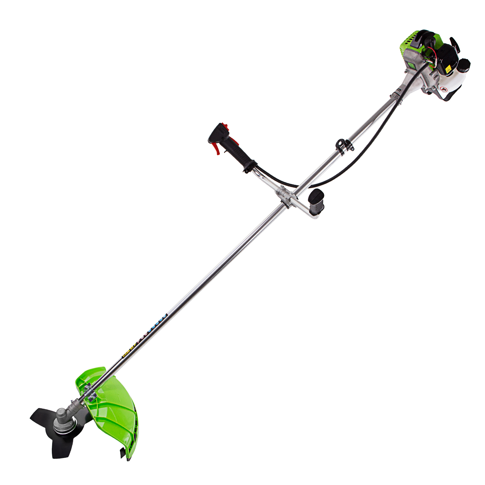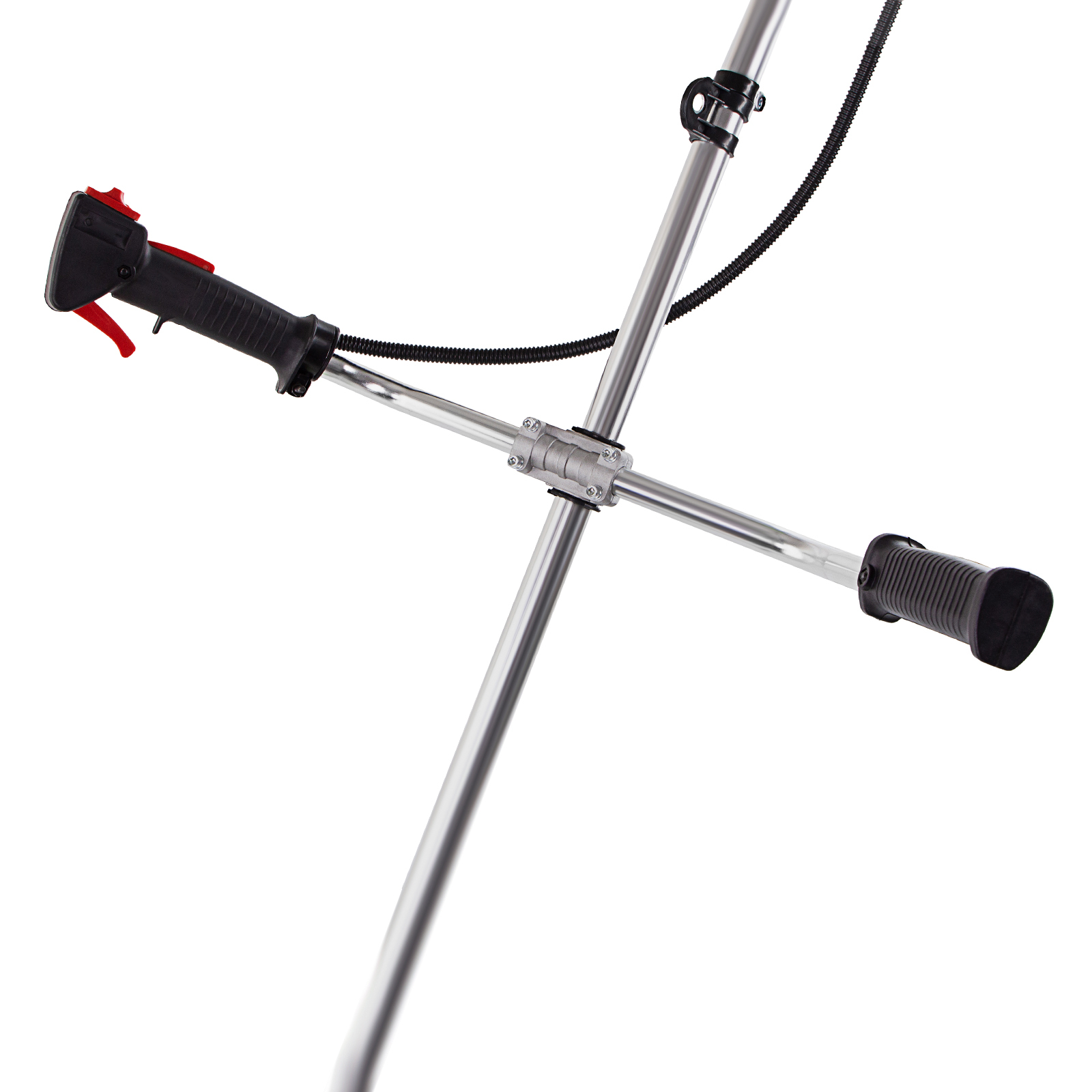 - Комфорт во время работы — ручки велосипедного типа обеспечивают оптимальное положение рук, а плечевой ремень равномерно распределяет вес инструмента, поэтому мотокосу удобно удерживать и направлять.
