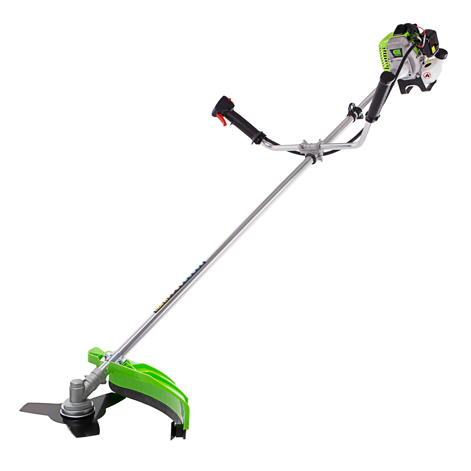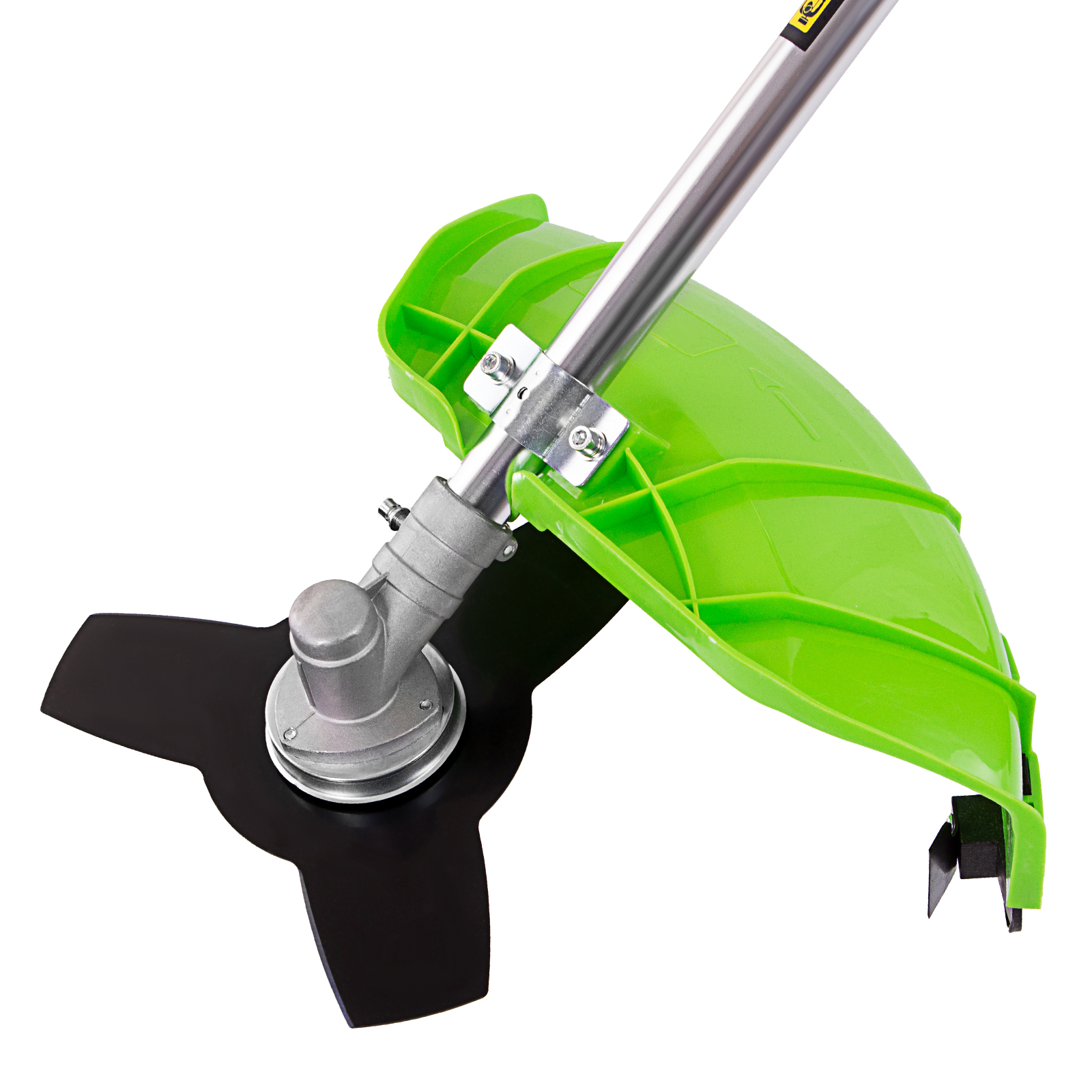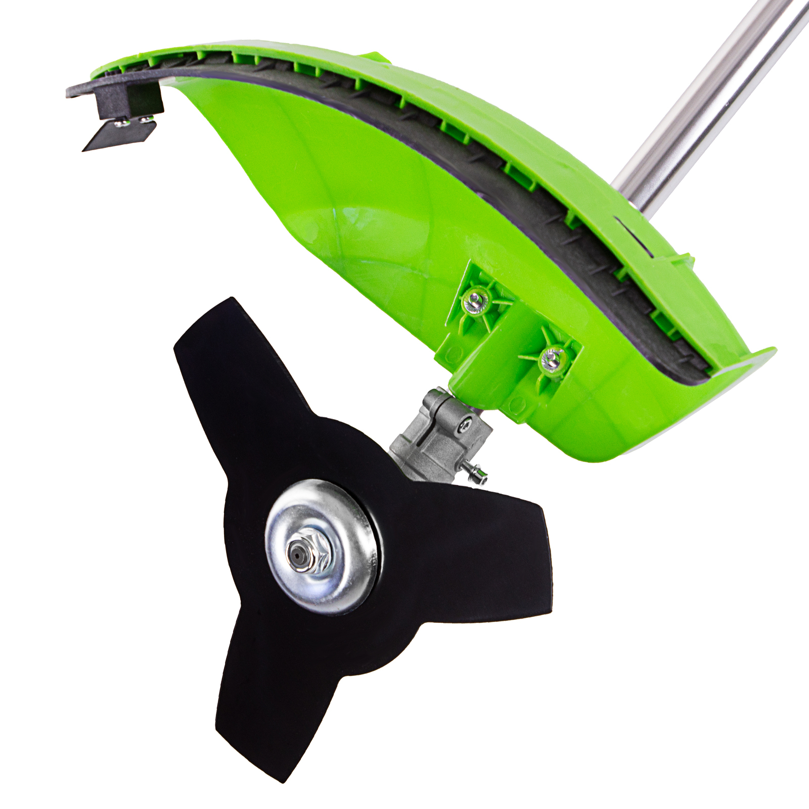 - Защита от летящей травы и веток — на штанге надежно закреплен прочный пластиковый кожух.