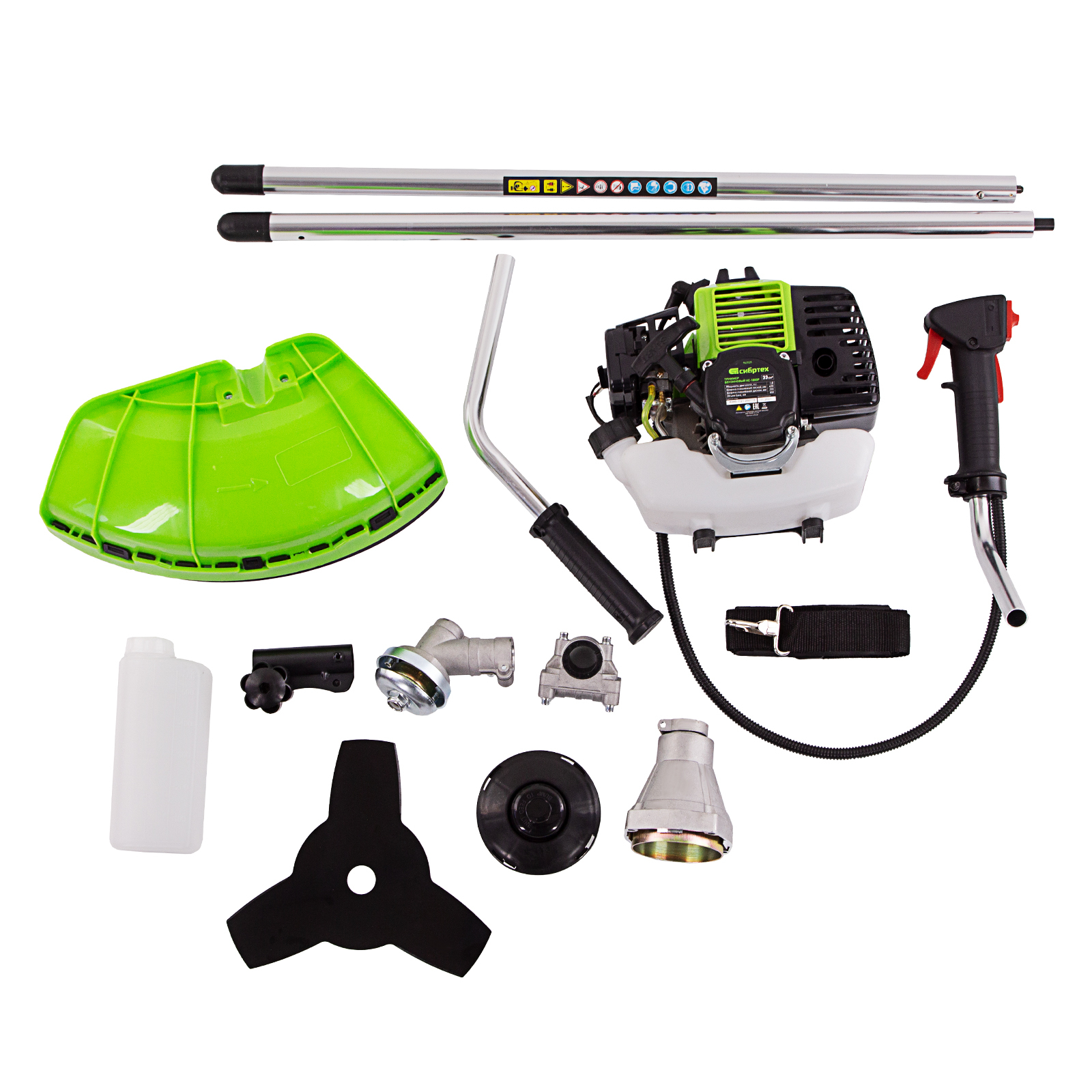 Двигатель с правой рукояткой - 1 штЛевая рукоятка - 1 штШтанга - 1 штЗащитный кожух с ножом - 1 штКронштейн защитного кожуха - 1 штКатушка с леской - 1 штНож трехлопастной - 1 штДозатор для приготовления смеси - 1 штРемень плечевой - 1 штКорпус сцепления с крепежом - 1 штРедуктор с винтами - 1 штУзел крепления рукояток с крепежом - 1 штУзел подвеса ремня - 1 штСвечной ключ - 1 штИмбусовый ключ Н5 - 1 штИмбусовый ключ Н6 - 1 штБолт M6×20 - 4 штБолт M5×15 - 2 штГайка M5 - 2 штХомут - 2 штСоединительная муфта - 1 штКоннектор штанги - 1 шт