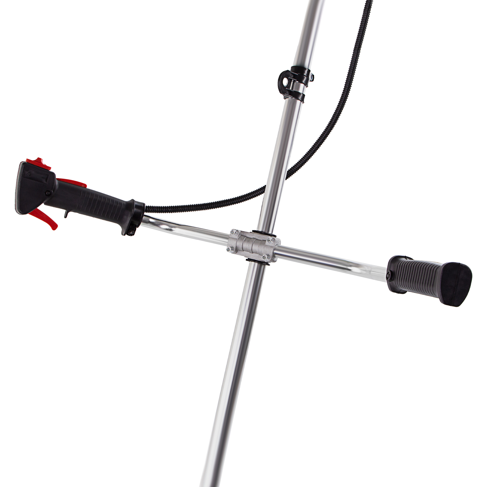 - Комфорт во время работы — ручки велосипедного типа обеспечивают оптимальное положение рук, а плечевой ремень равномерно распределяет вес инструмента, поэтому мотокосу удобно удерживать и направлять.