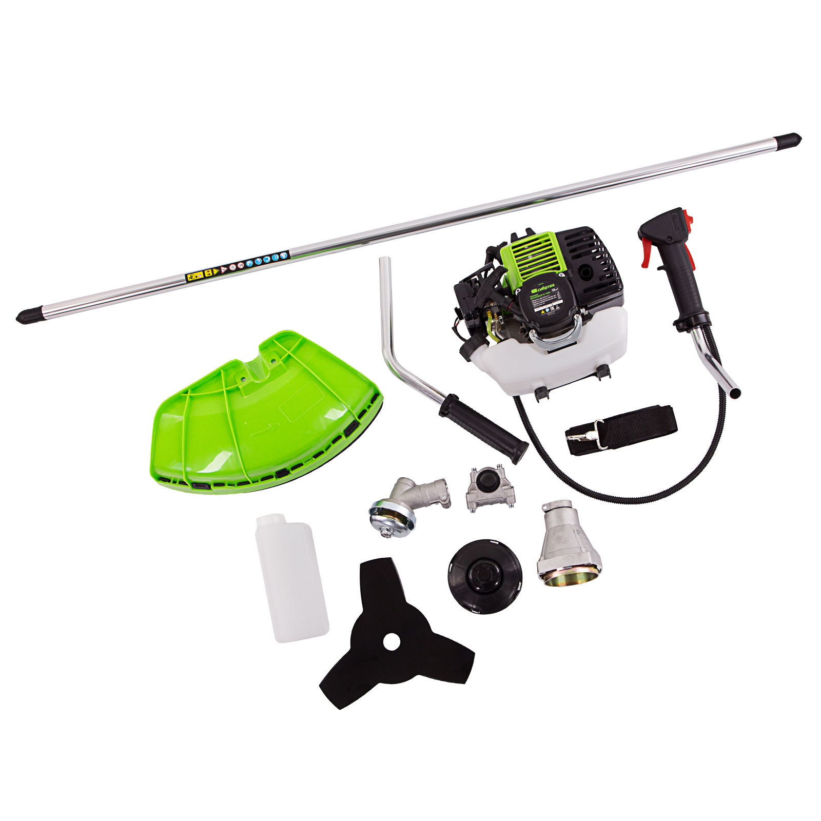 Двигатель с правой рукояткой - 1 штЛевая рукоятка - 1 штШтанга - 1 штЗащитный кожух с ножом - 1 штКронштейн защитного кожуха - 1 штКатушка с леской - 1 штНож трехлопастной - 1 штДозатор для приготовления смеси - 1 штРемень плечевой - 1 штКорпус сцепления с крепежом - 1 штРедуктор с винтами - 1 штУзел крепления рукояток с крепежом - 1 штУзел подвеса ремня - 1 штСвечной ключ - 1 штИмбусовый ключ Н5 - 1 штИмбусовый ключ Н6 - 1 штБолт M6×20 - 4 штБолт M5×15 - 2 штГайка M5 - 2 штХомут - 2 шт