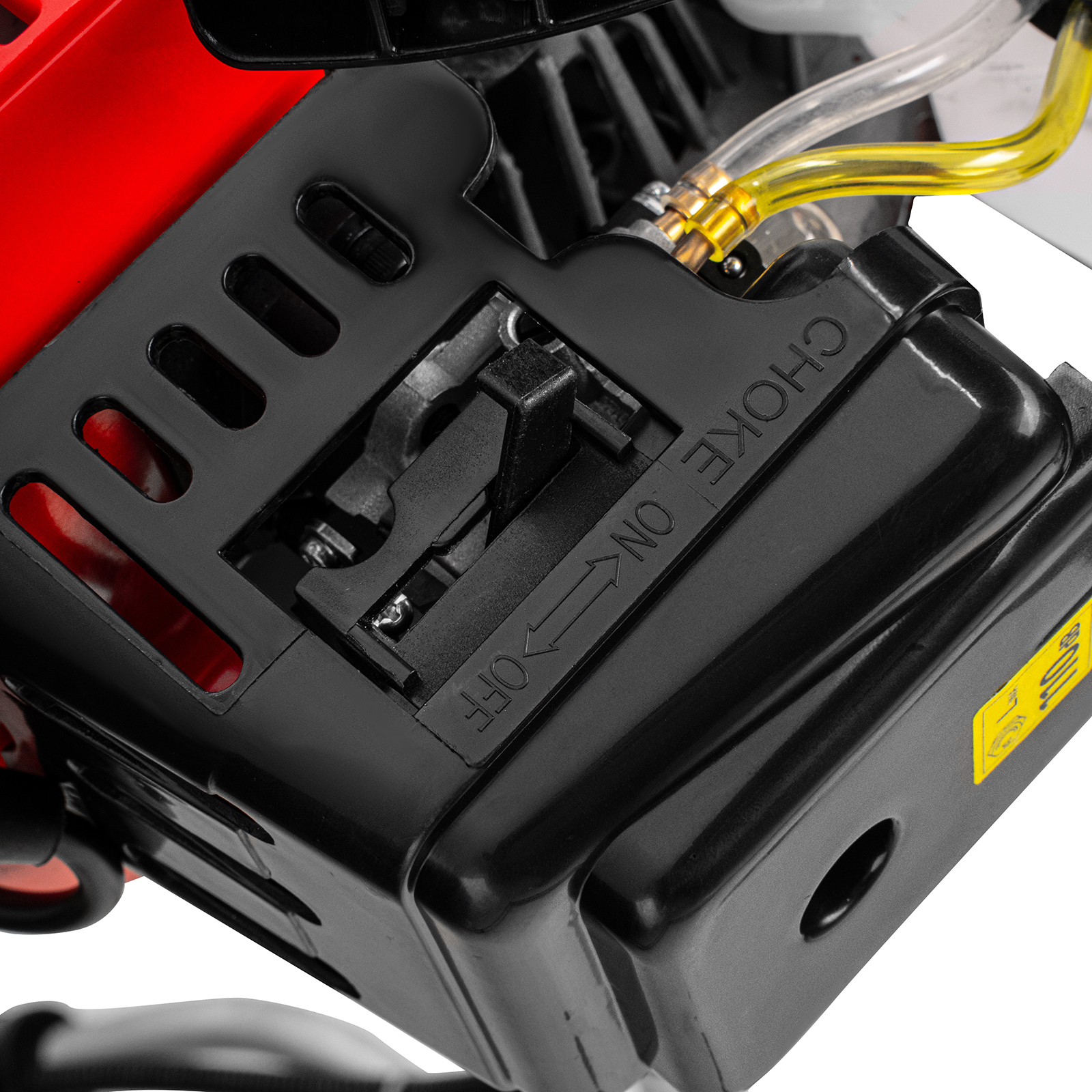 - Безопасность — производитель предусмотрел блокировку курка газа для предотвращения случайного запуска, защитный кожух препятствует вылету травы, веток, камней в сторону пользователя.