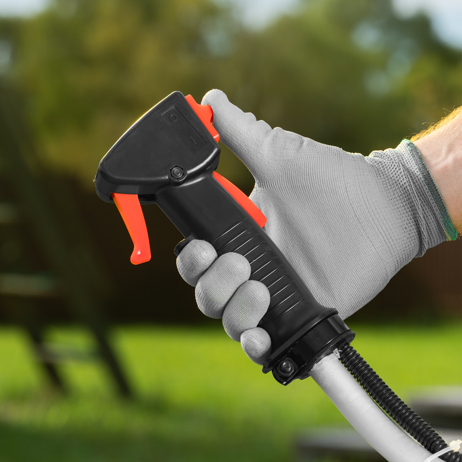 - Удобное хранение и транспортировка — благодаря разъемной штанге триммер не занимает много места.