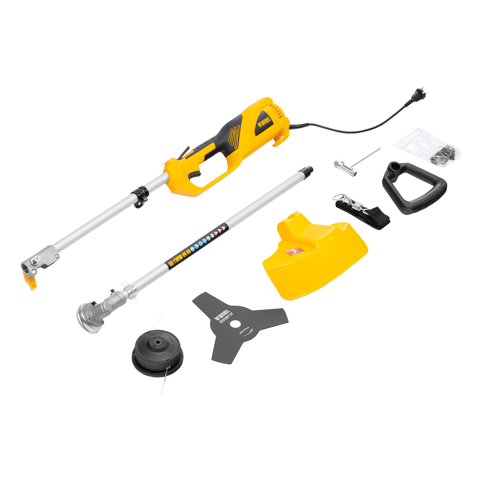Триммер - 1 штКатушка с леской - 1 штДиск - 1 штРемень наплечный - 1 штРукоятка - 1 штКожух защитный - 1 штНабор ключей - 1 штРуководство по эксплуатации - 1 штГарантийный талон - 1 шт