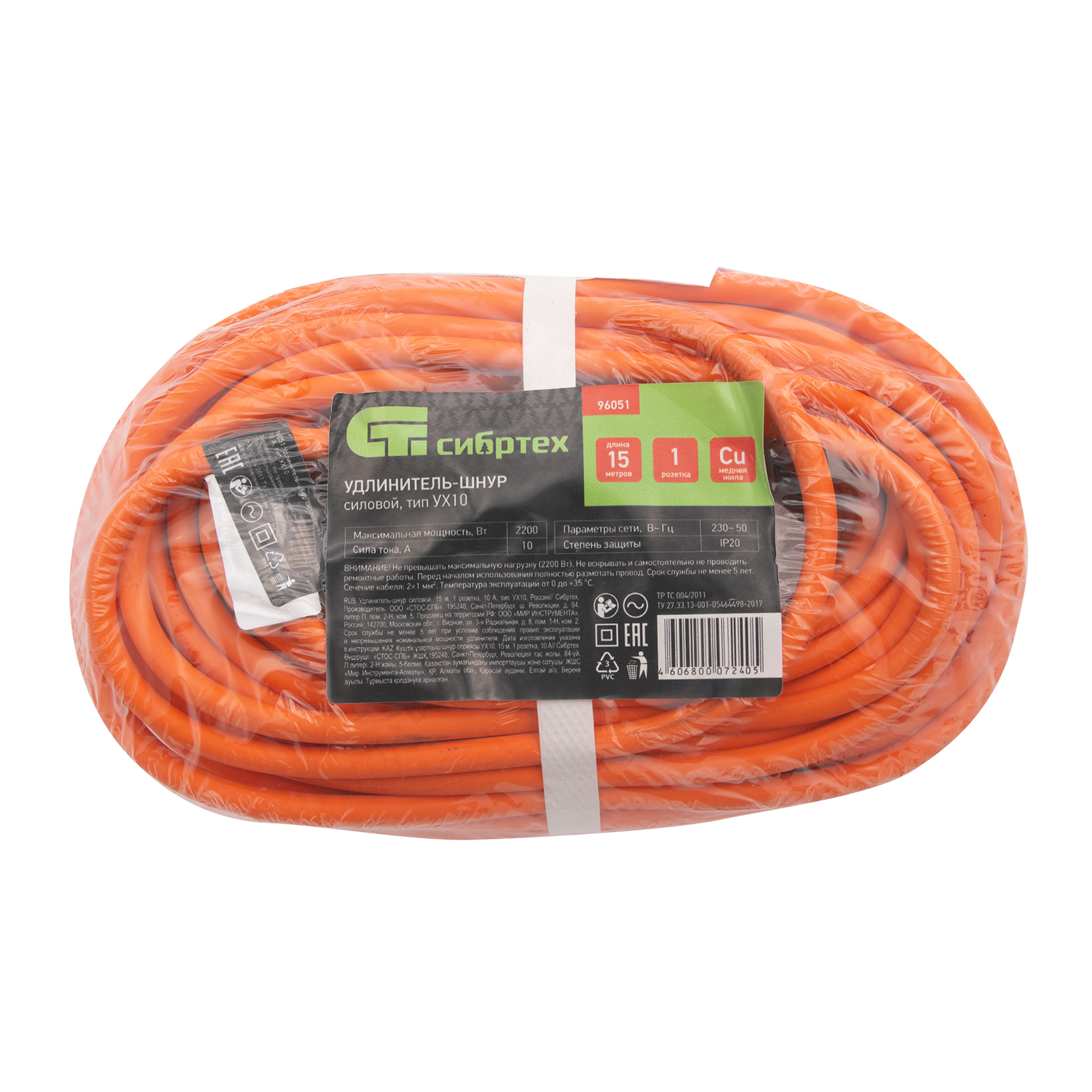 Силовой удлинитель-шнур Сибртех 96051, тип УХ10, с 1 розеткой, рассчитан на силу тока 10 A и позволяет подключать к электросети электроприборы мощностью до 2200 Вт на расстоянии до 15 м от источника электроснабжения. Яркий оранжевый кабель хорошо заметен даже в густой траве и среди строительного мусора. Сетевой удлинитель используется во время строительных и монтажных работ, а также пригодится дома, на даче или в гараже.
