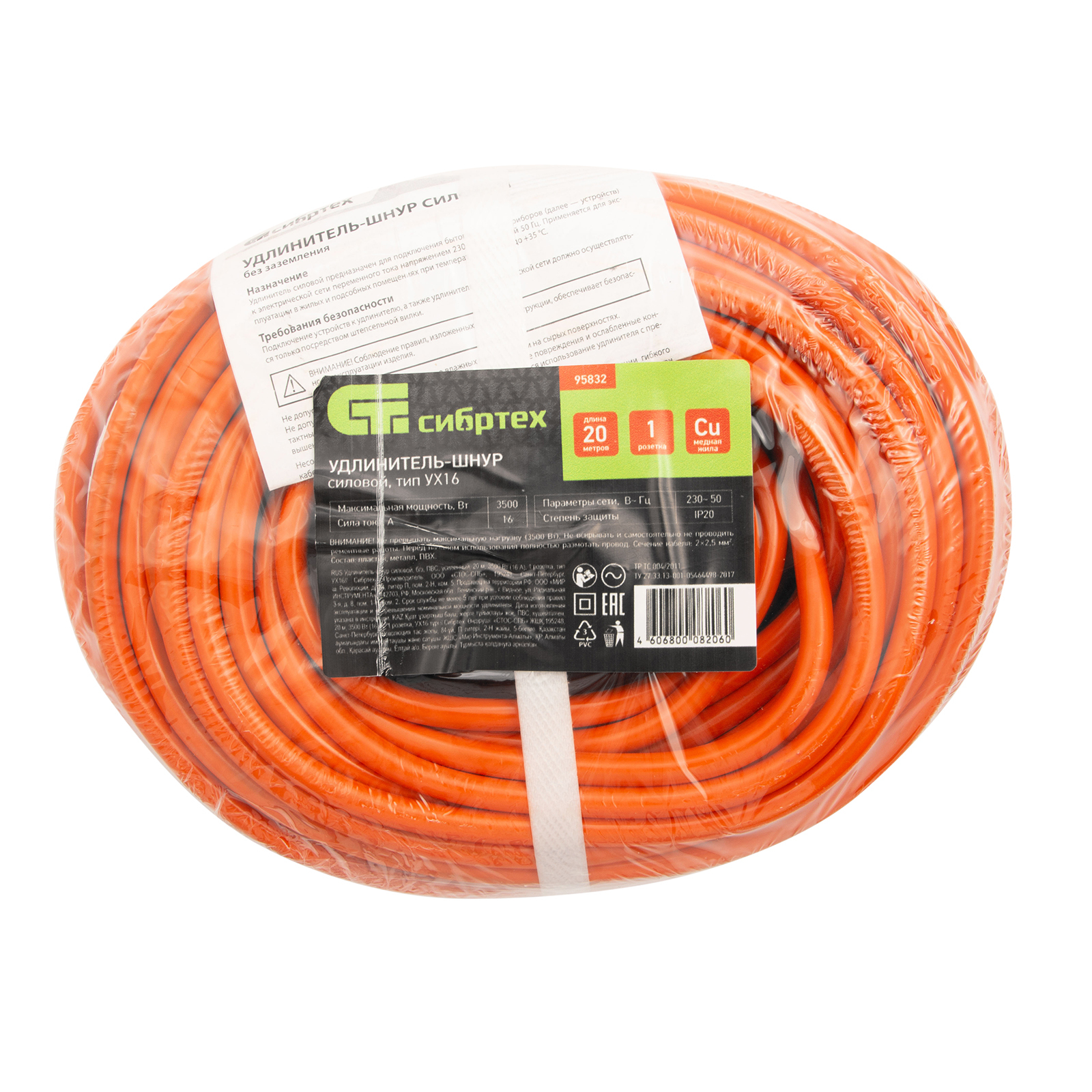 Удлинитель-шнур силовой 20 м, 16А, тип УХ16, ПВС, усиленный, 1 розетка без заземления Сибртех