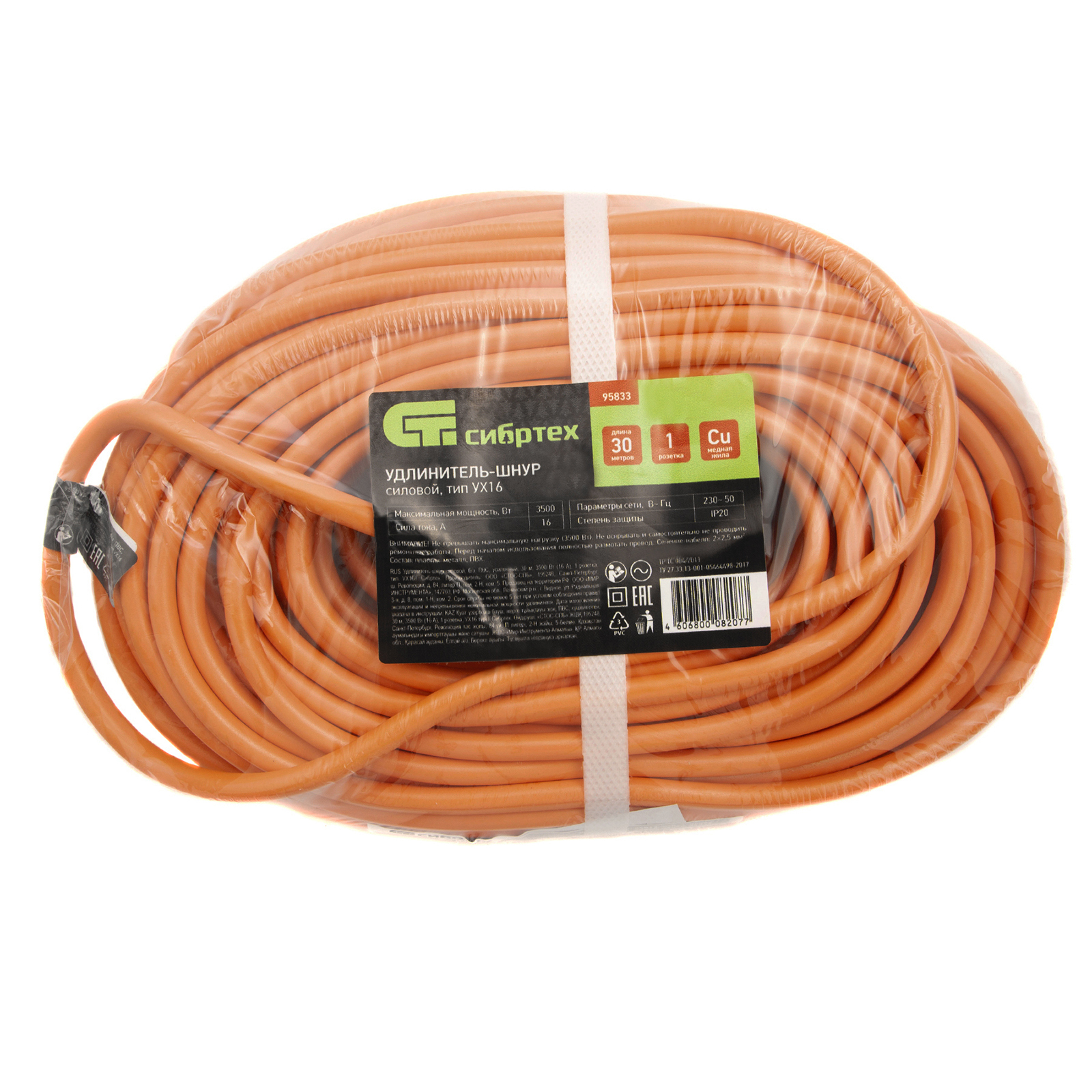 Удлинитель-шнур силовой 30 м, 16А, тип УХ16, ПВС, усиленный, 1 розетка без заземления Сибртех
