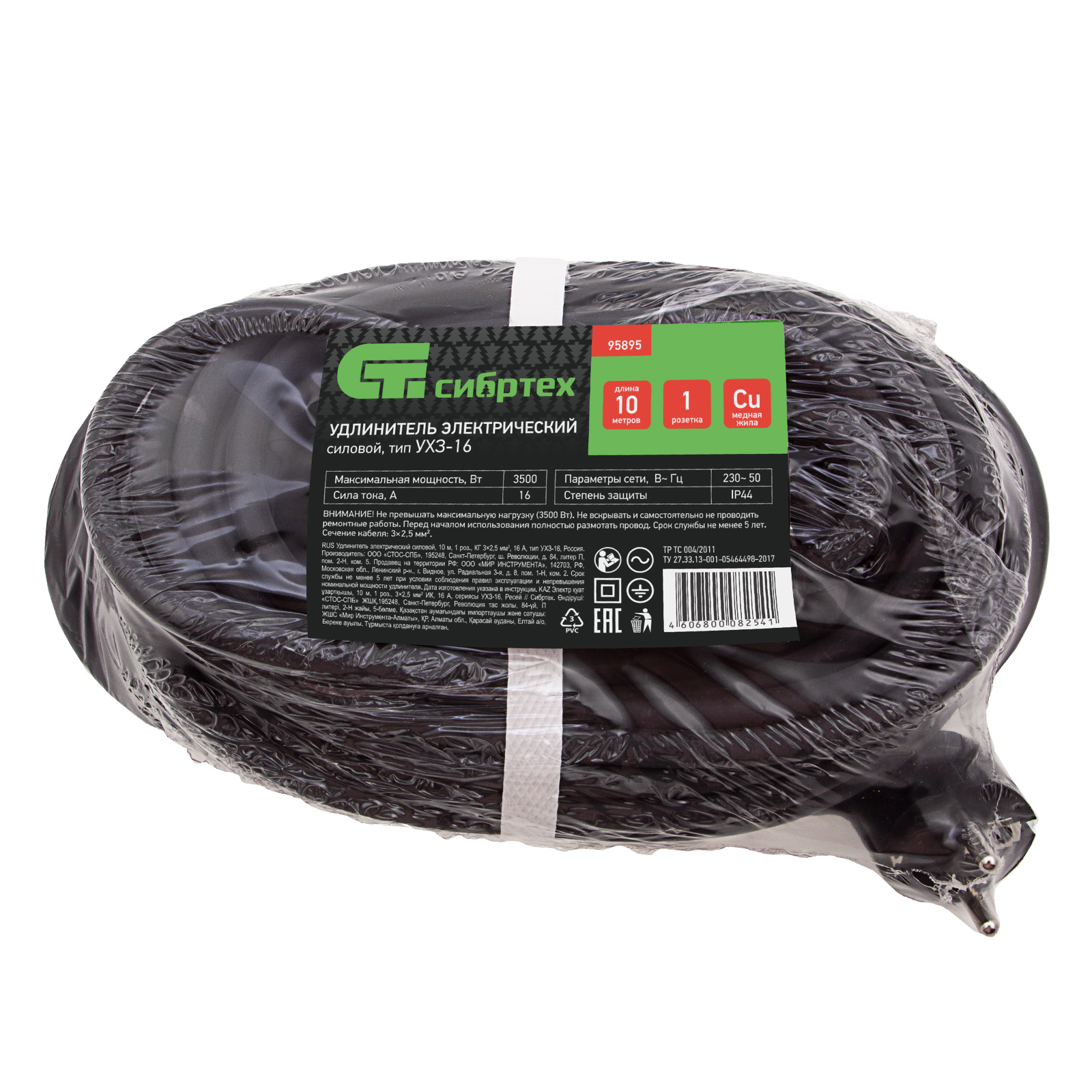 Удлинитель силовой 10 м, 16 А, тип УХз16, КГ 3 x 2.5 мм, 1 розетка, Сибртех