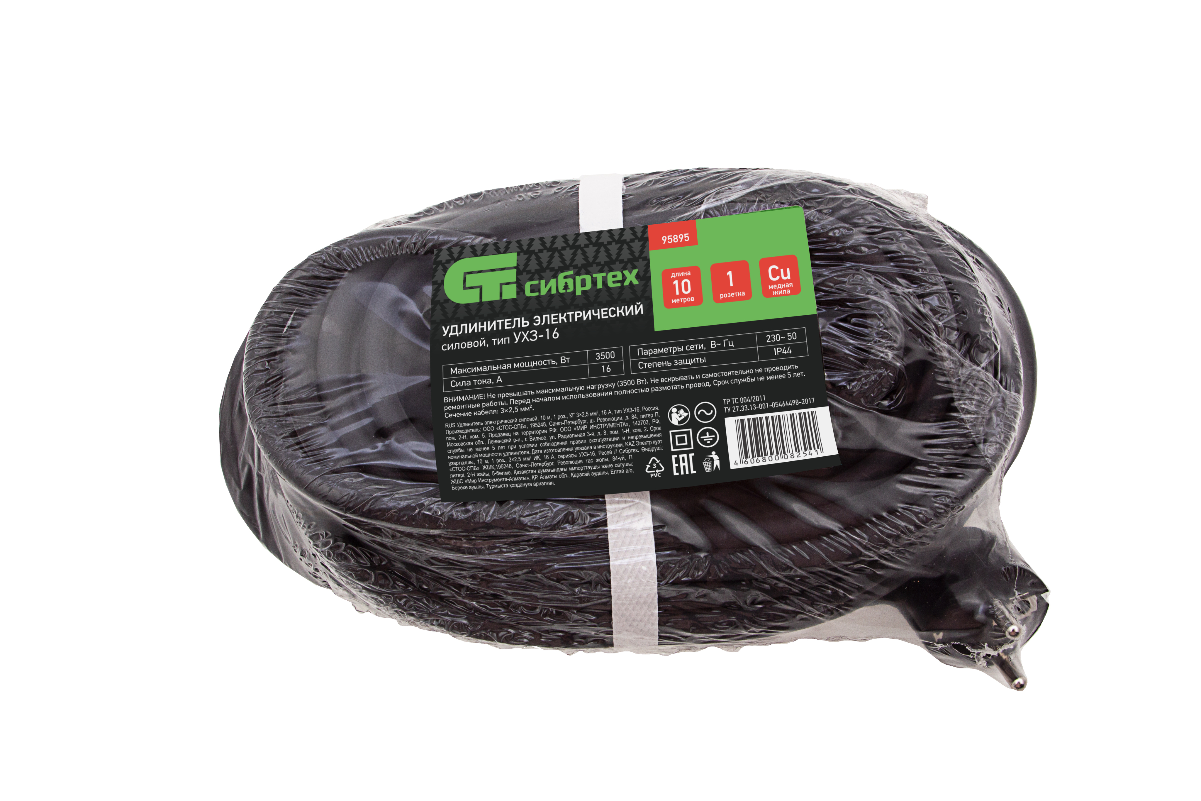 Силовой удлинитель Сибртех 95895, тип УХЗ-16, 16 А, тип кабеля КГ 3 х 2,5 мм, с 1 розеткой, позволяет подключать электрооборудование к сети на расстоянии до 10 м от стационарного источника электроснабжения. Медножильный кабель выдерживает нагрузку до 3500 Вт и рассчитан на длительное использование. Розетка закрывается защитной крышкой, предотвращающей попадание грязи и влаги на разъемы. Сетевой удлинитель используется в строительстве и на производстве.