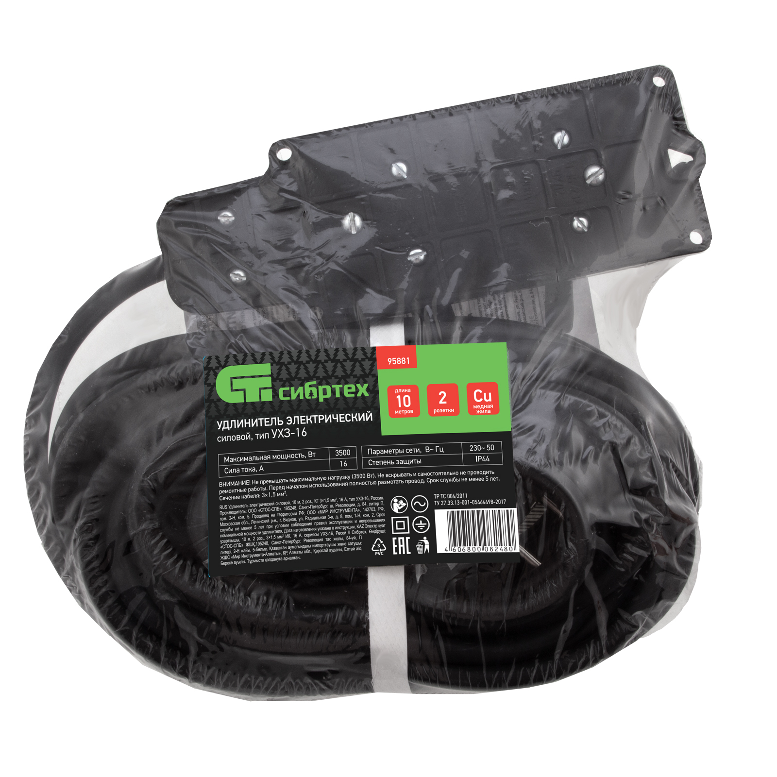 Удлинитель силовой 10 м, 16А, тип УХз16, КГ 3 x 1.5 мм, 2 розетки, Сибртех