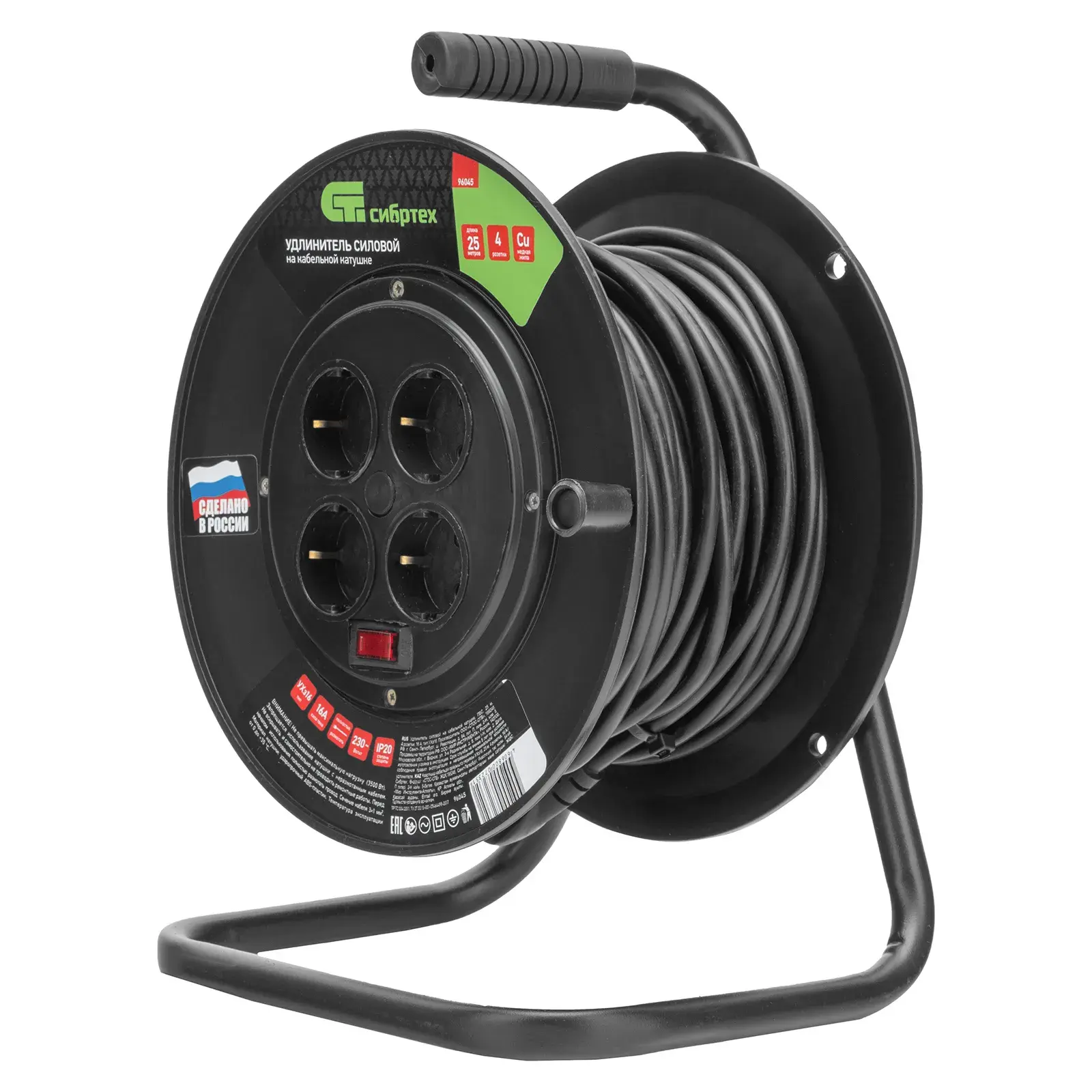 Удлинитель силовой 25 м, 16А, тип УХз16, ПВС, на кабельной катушке, 4 розетки, Сибртех