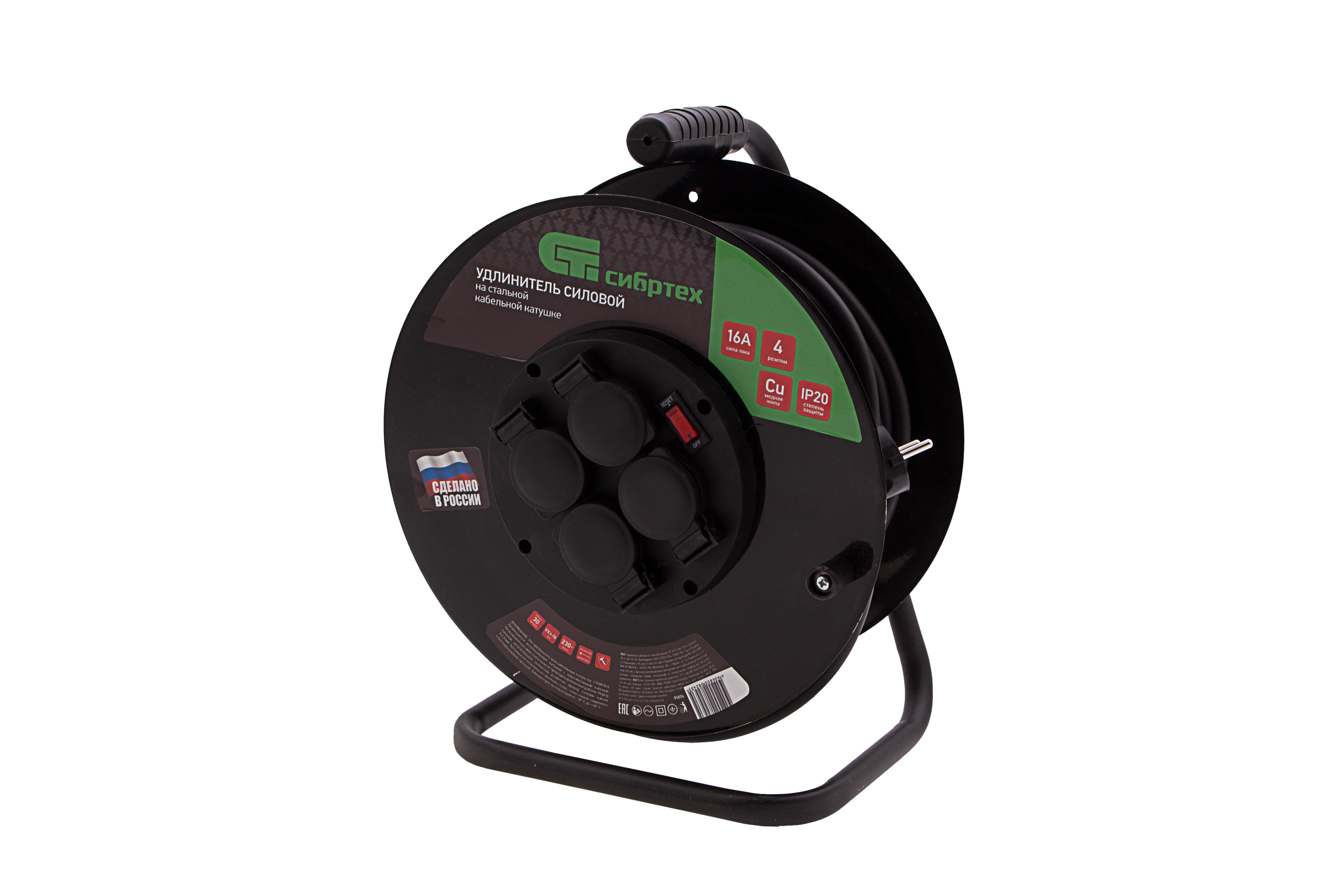 Силовой удлинитель на стальной катушке Сибртех 95876, 16 А, тип УХз-16, кабель КГ 3 х 1,5 мм, с 4 розетками, позволяет использовать электрооборудование на расстоянии до 30 м от источника электроснабжения. Выдерживает нагрузку до 3500 Вт. Стальной корпус катушки рассчитан на интенсивное использование. Розеточная группа выполнена из пластика, что позволило уменьшить вес сетевого удлинителя. Изделие предназначено для профессиональных работ в строительстве и на производстве.
