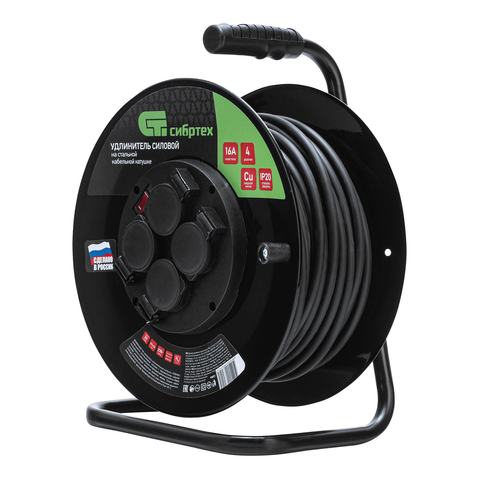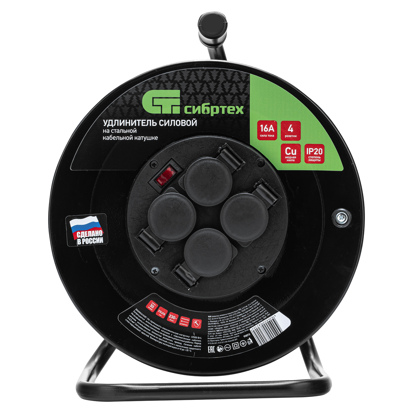Удлинитель силовой 30 м, 16А, тип УХз16, ПВС 3 x 2.5 мм, на стальной катушке, 4 розетки Сибртех