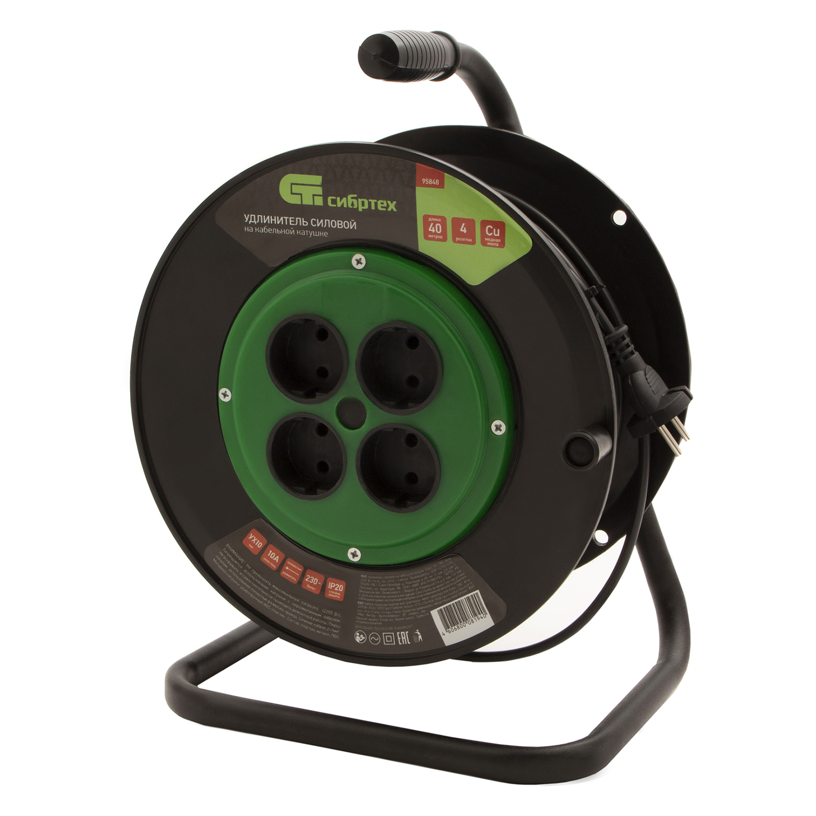 Удлинитель силовой 40 м, 10А, тип УХ10, ПВС, на кабельной катушке, 4 розетки без заземления Сибртех