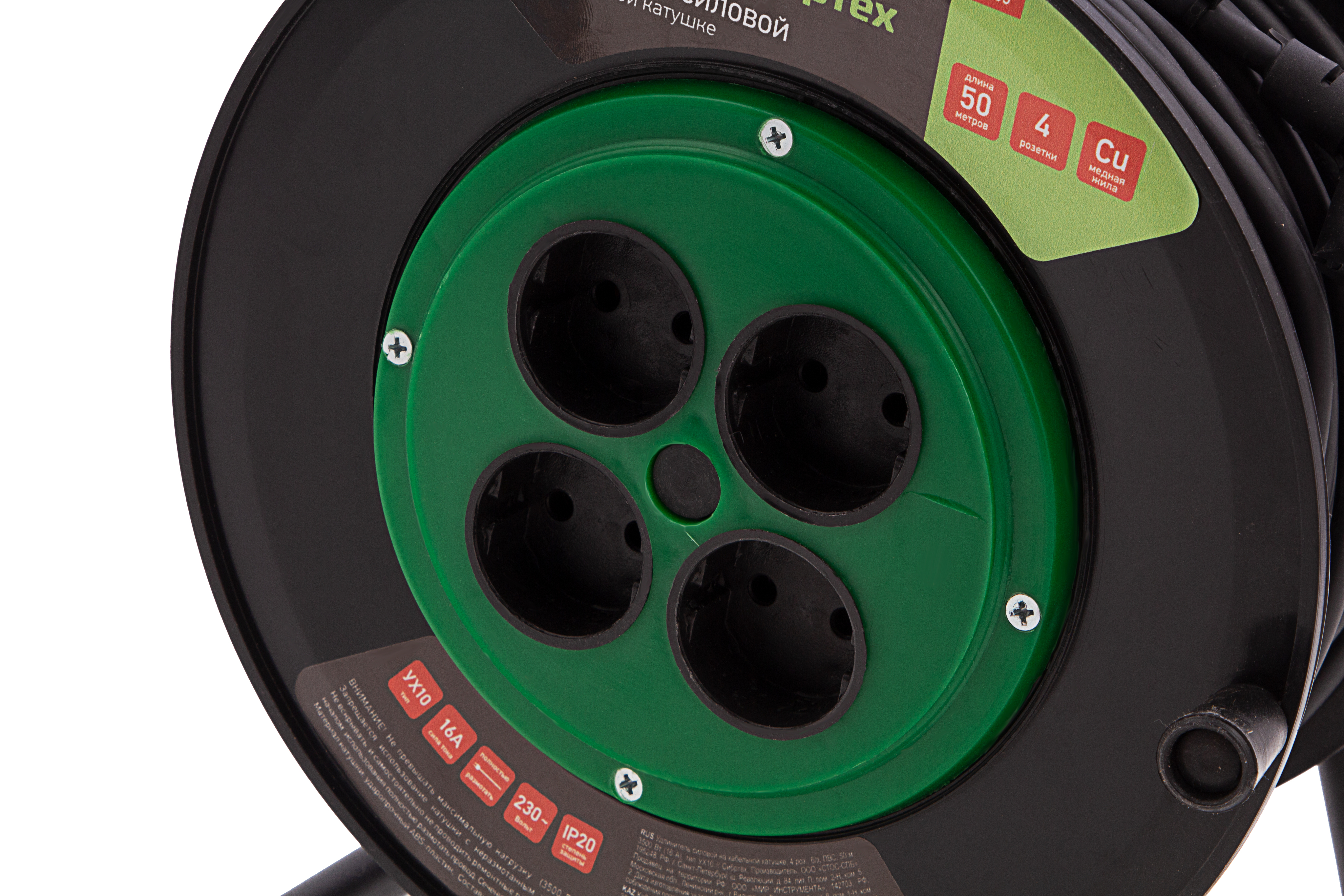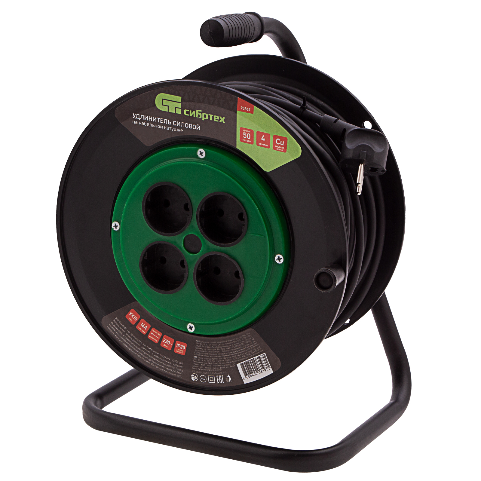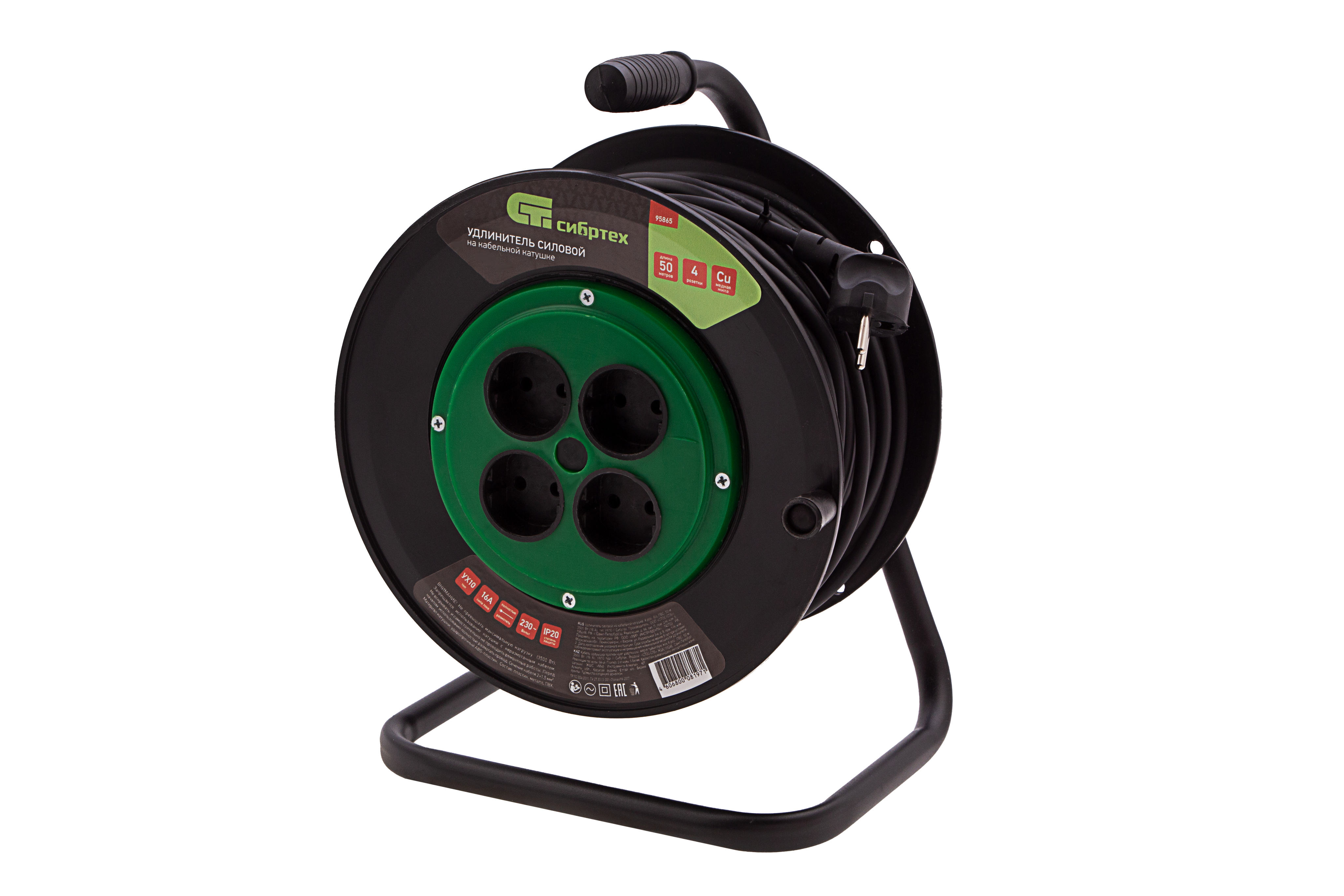 Удлинитель силовой 50 м, 16А, тип УХ10, ПВС, на кабельной катушке, 4 розетки без заземления Сибртех