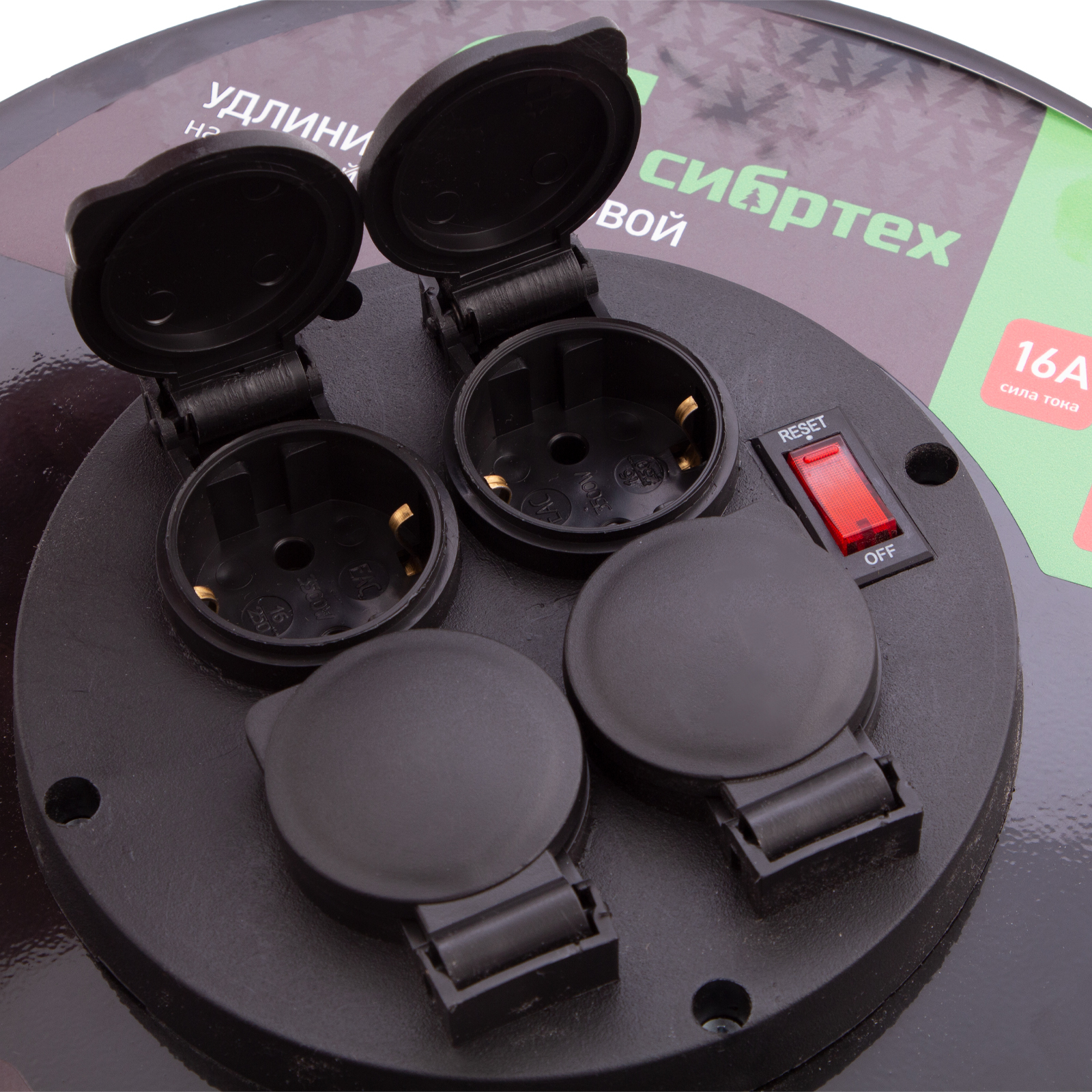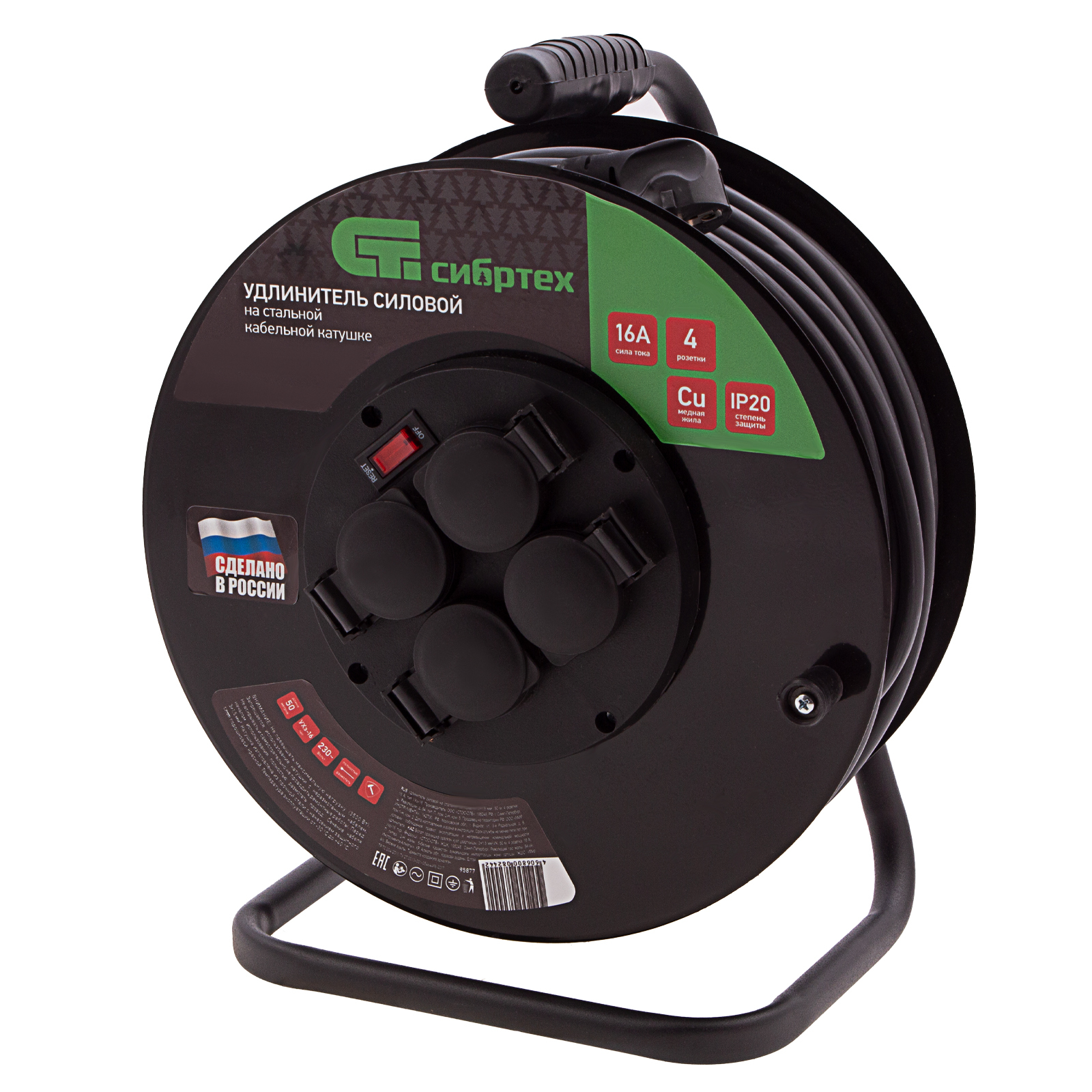 Удлинитель силовой 50 м, 16А, тип УХз16, КГ 3 x 1.5 мм, на стальной катушке, 4 розетки Сибртех
