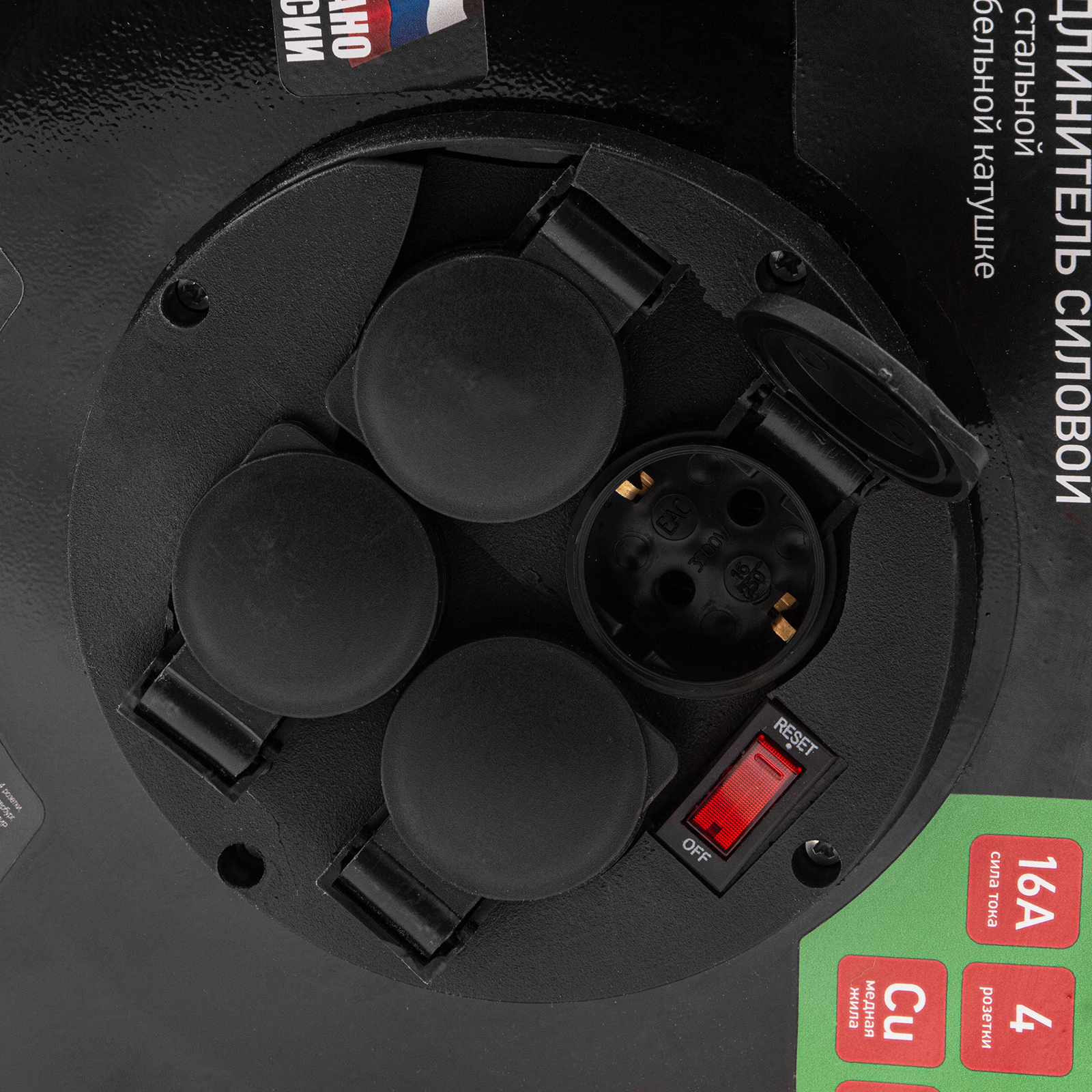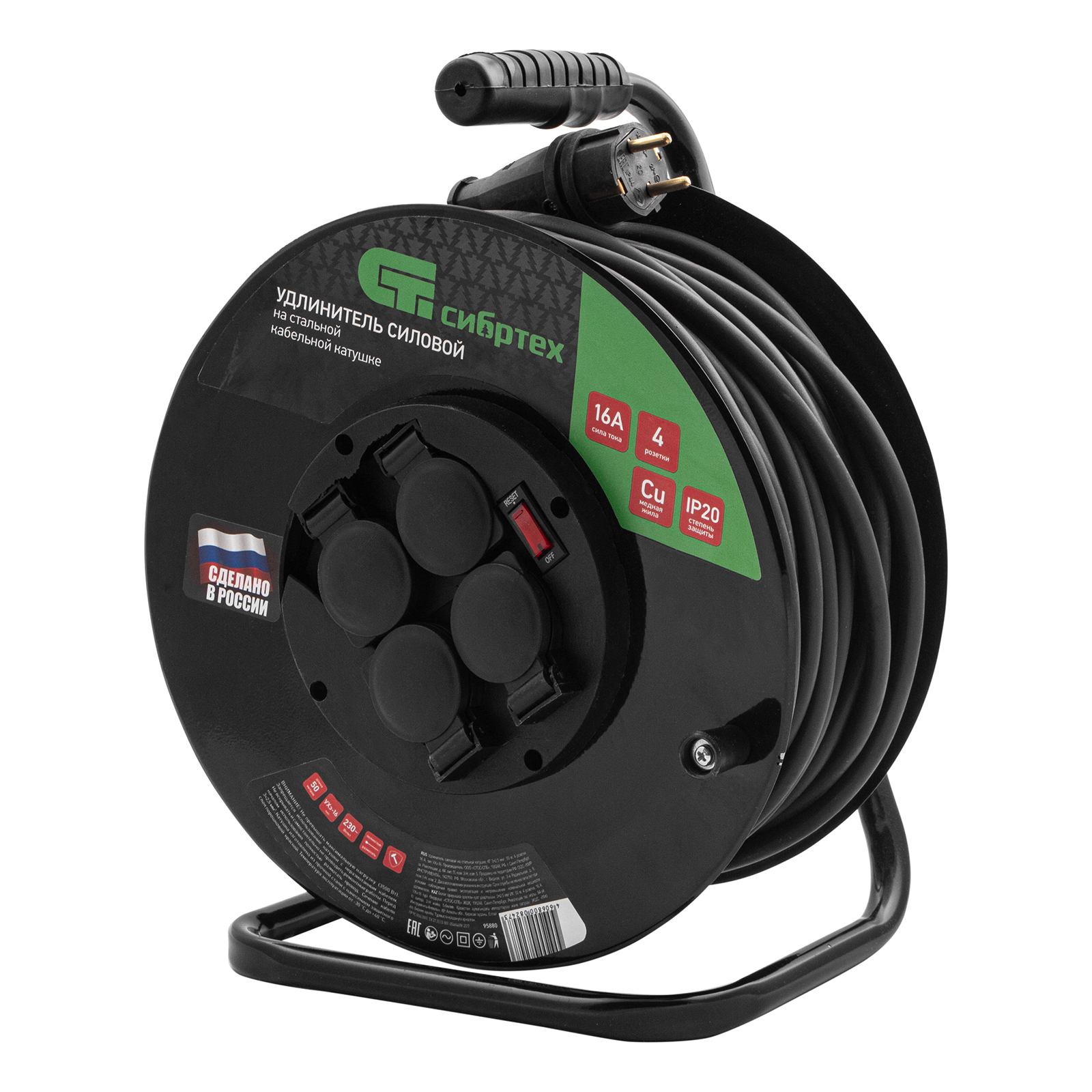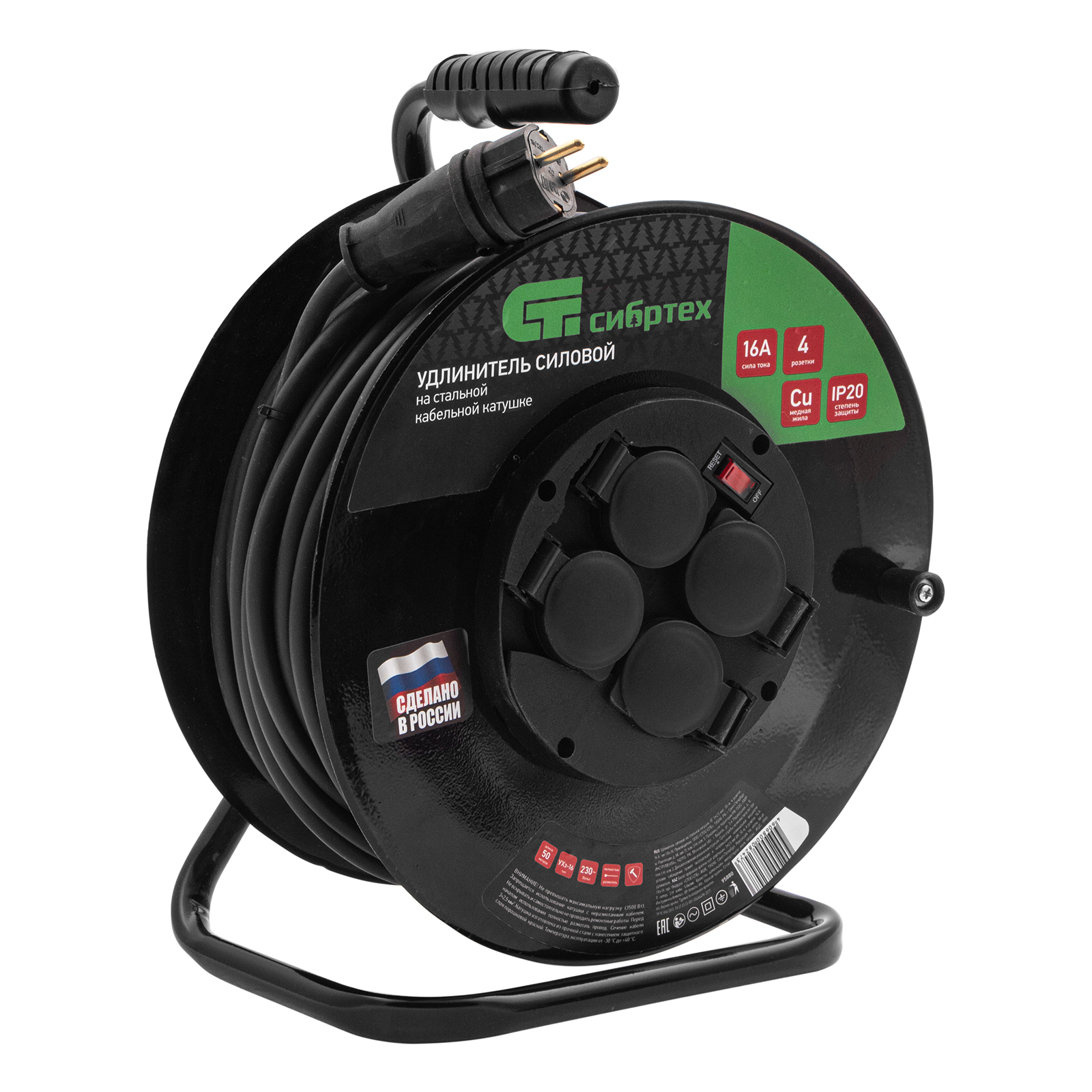 Удлинитель силовой 50 м, 16А, тип УХз16, КГ 3 x 2.5 мм, на стальной катушке, 4 розетки Сибртех