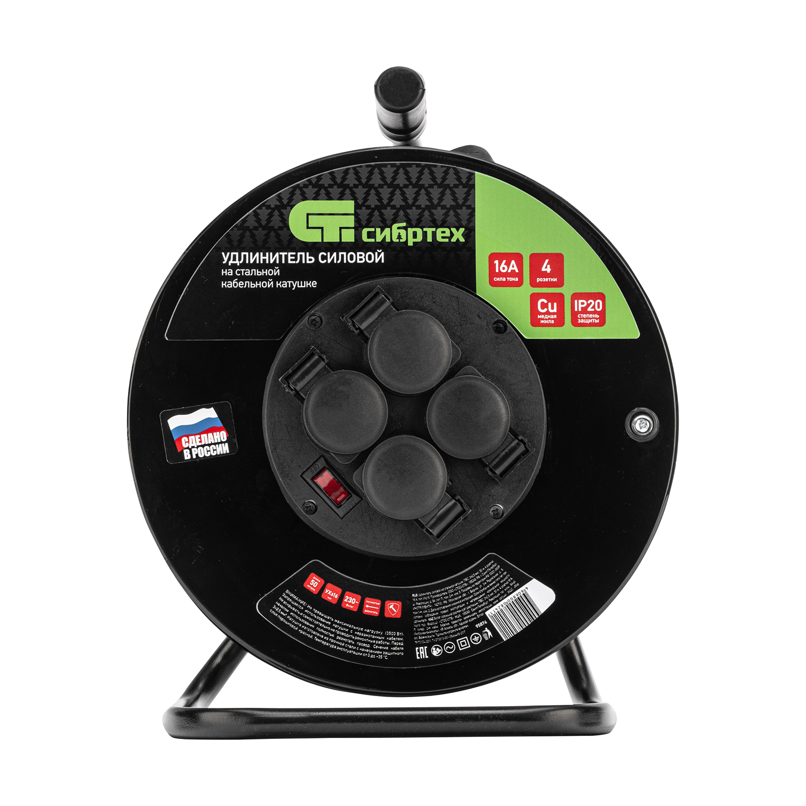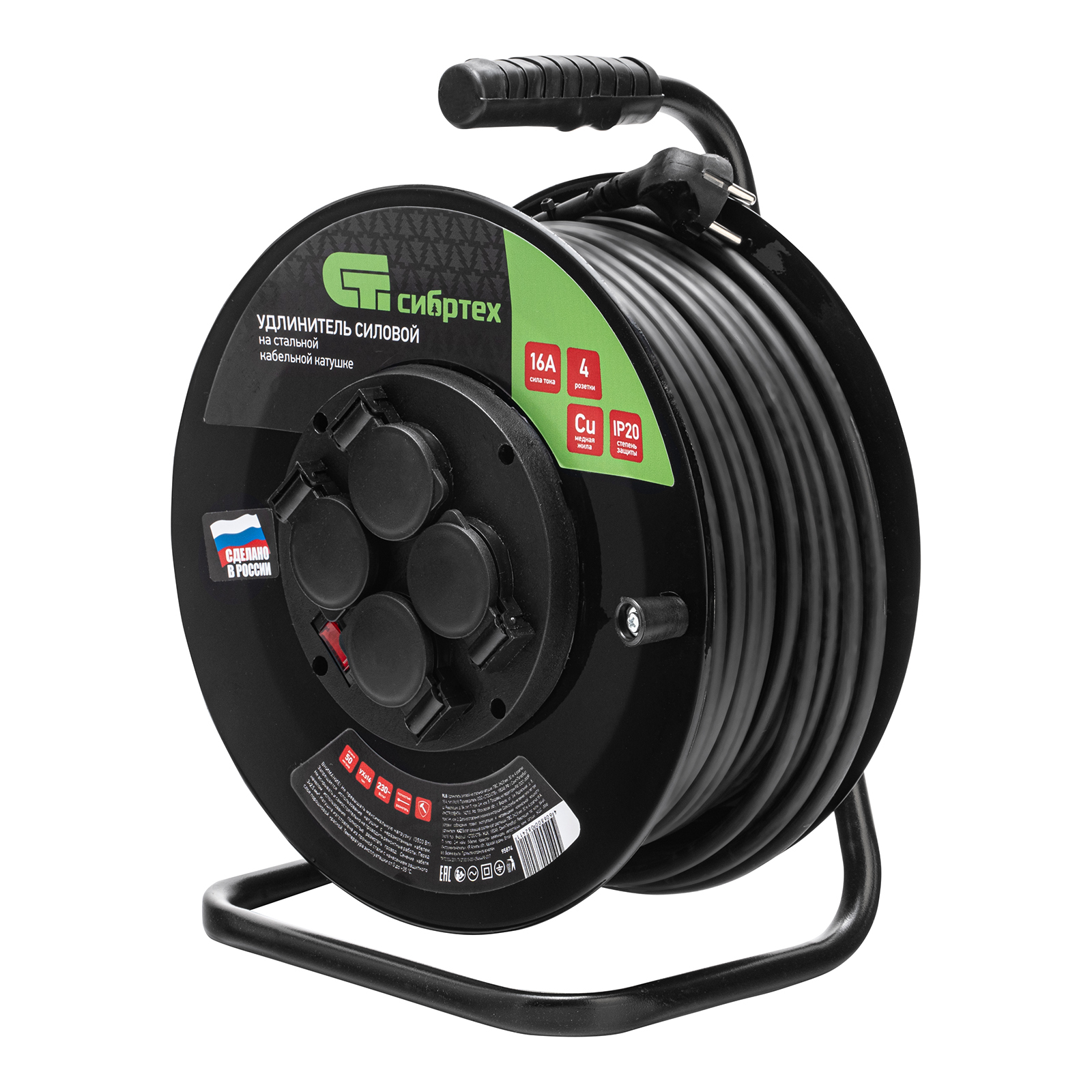 Удлинитель силовой 50 м, 16А, тип УХз16, ПВС 3 x 2.5 мм, на стальной катушке, 4 розетки Сибртех