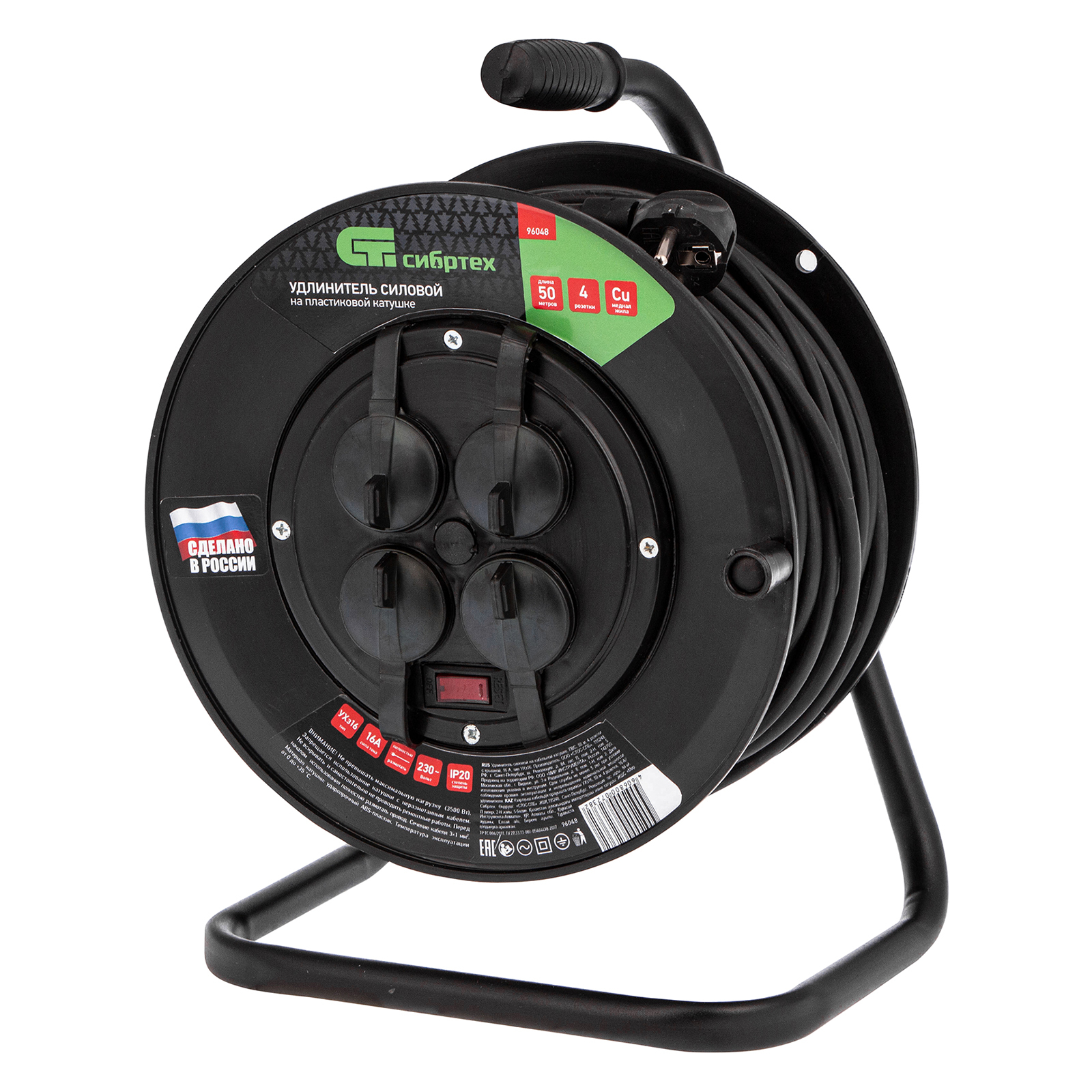 Силовой удлинитель на кабельной катушке Сибртех 96048 типа УХз16, 16 А, степень защиты IP44, имеет 4 розетки с крышкой для подключения различного электрооборудования суммарной мощностью 3500 Вт, используемого на расстоянии до 50 м от стационарного источника питания. Удобная ручка облегчает разматывание и сматывание кабеля. Заземляющие контакты розеток предотвращают поражение пользователя электрическим током. Розетки закрываются крышками, защищающими разъемы от попадания влаги и грязи. Сетевой удлинитель пригодится для работы с инструментом на строительной площадке или дачном участке.