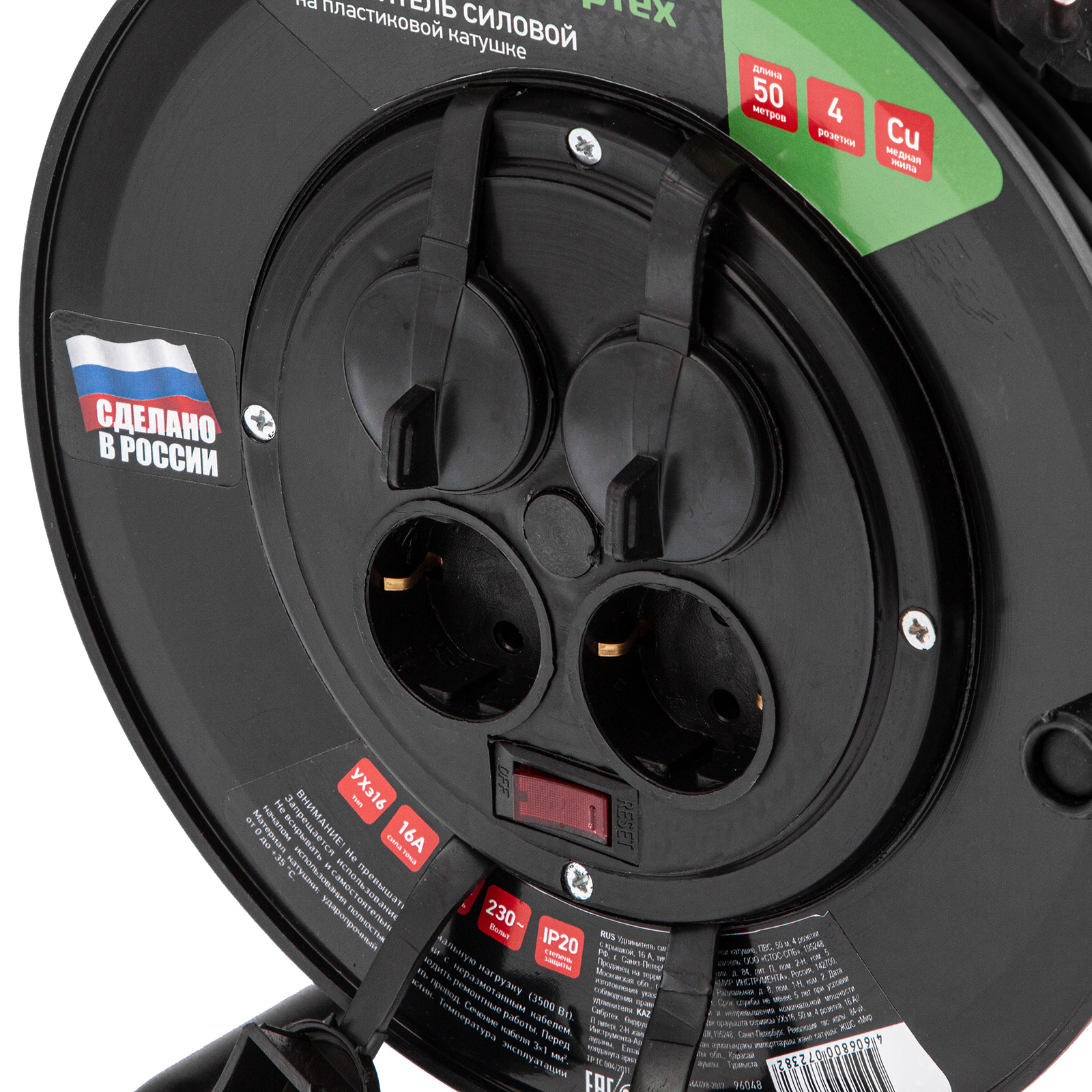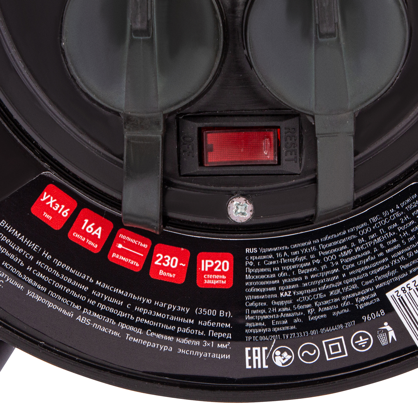 Удлинитель силовой на кабельной катушке, ПВС, 50 м, 4 розетки с крышкой, IP44, 16А, УХз16, Сибртех