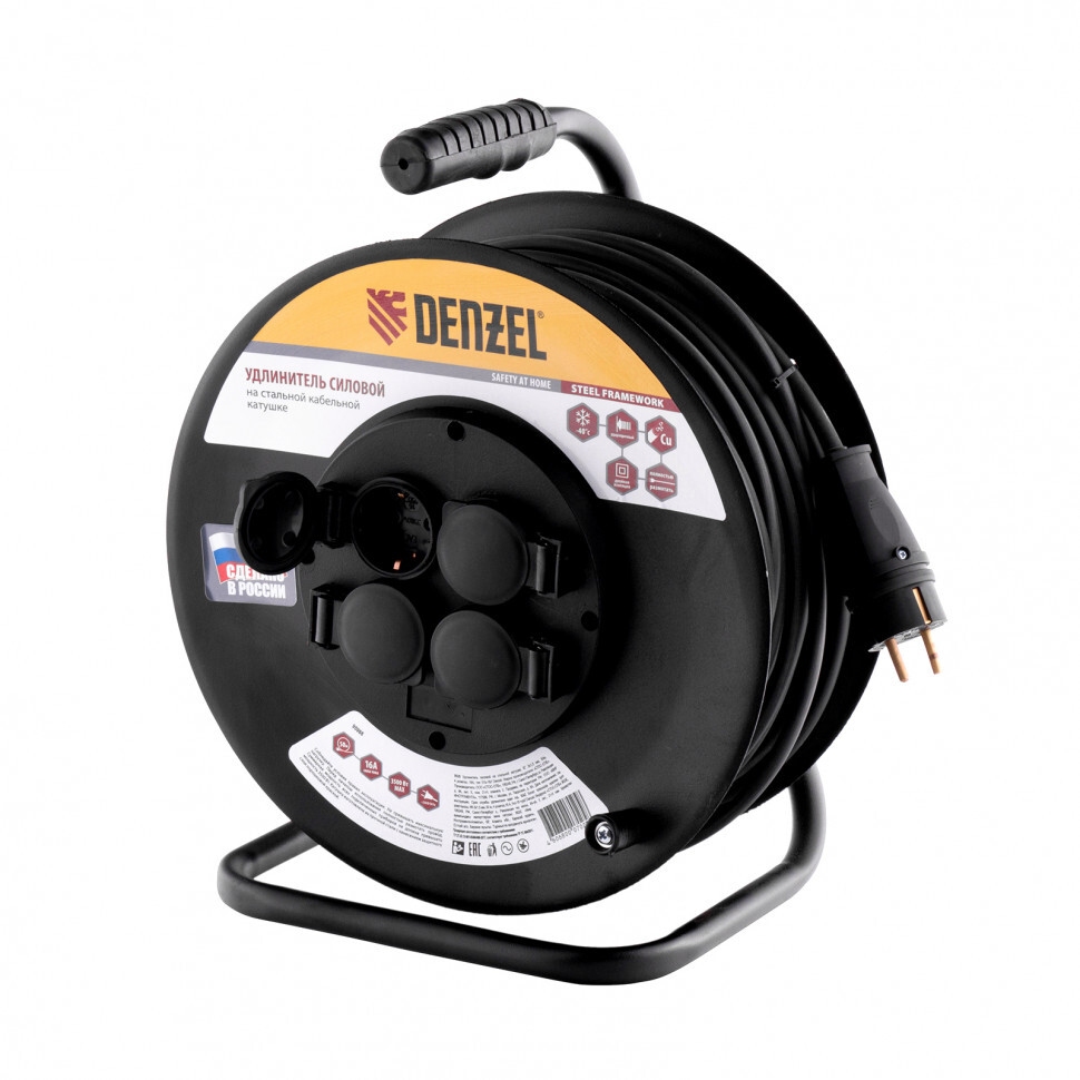 Силовой удлинитель на стальной катушке Denzel 95989 серии УХз-16, с кабелем типа КГ с сечением 3 х 2,5 мм, с 4 розетками, рассчитан на силу тока 16 А и позволяет работать с электрооборудованием на расстоянии до 20 м от источника питания. Медножильный кабель выдерживает нагрузку до 3500 Вт. Кабель типа КГ устойчив к температуре от -40 °С до +50 °C, поэтому удлинитель подходит для профессионального использования в строительстве и на производстве.