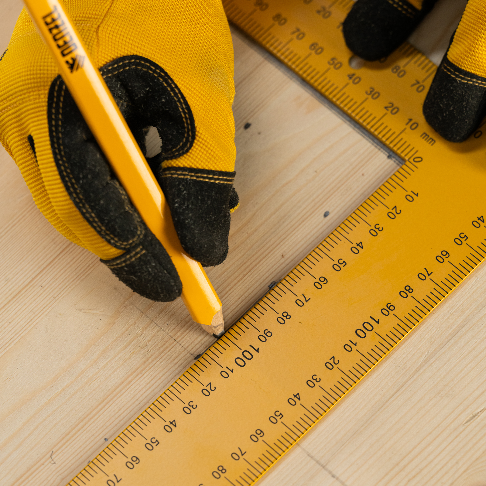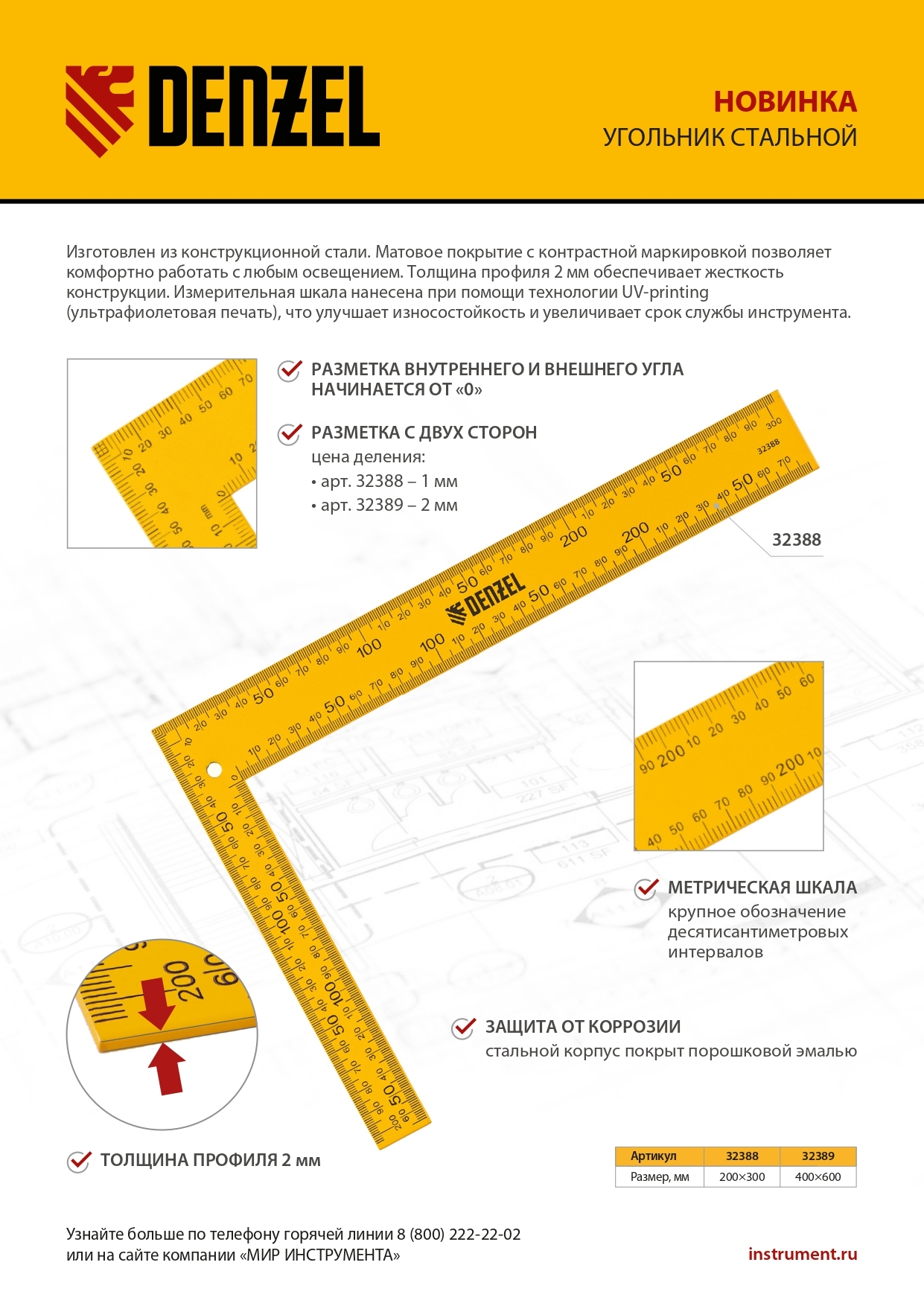 Стальной угольник Denzel 32389 размером 400 х 600 мм используется для разметки поверхностей и проверки прямых углов. Четкая двусторонняя измерительная шкала упрощает работу. Инструмент пригодится для выполнения столярных работ.