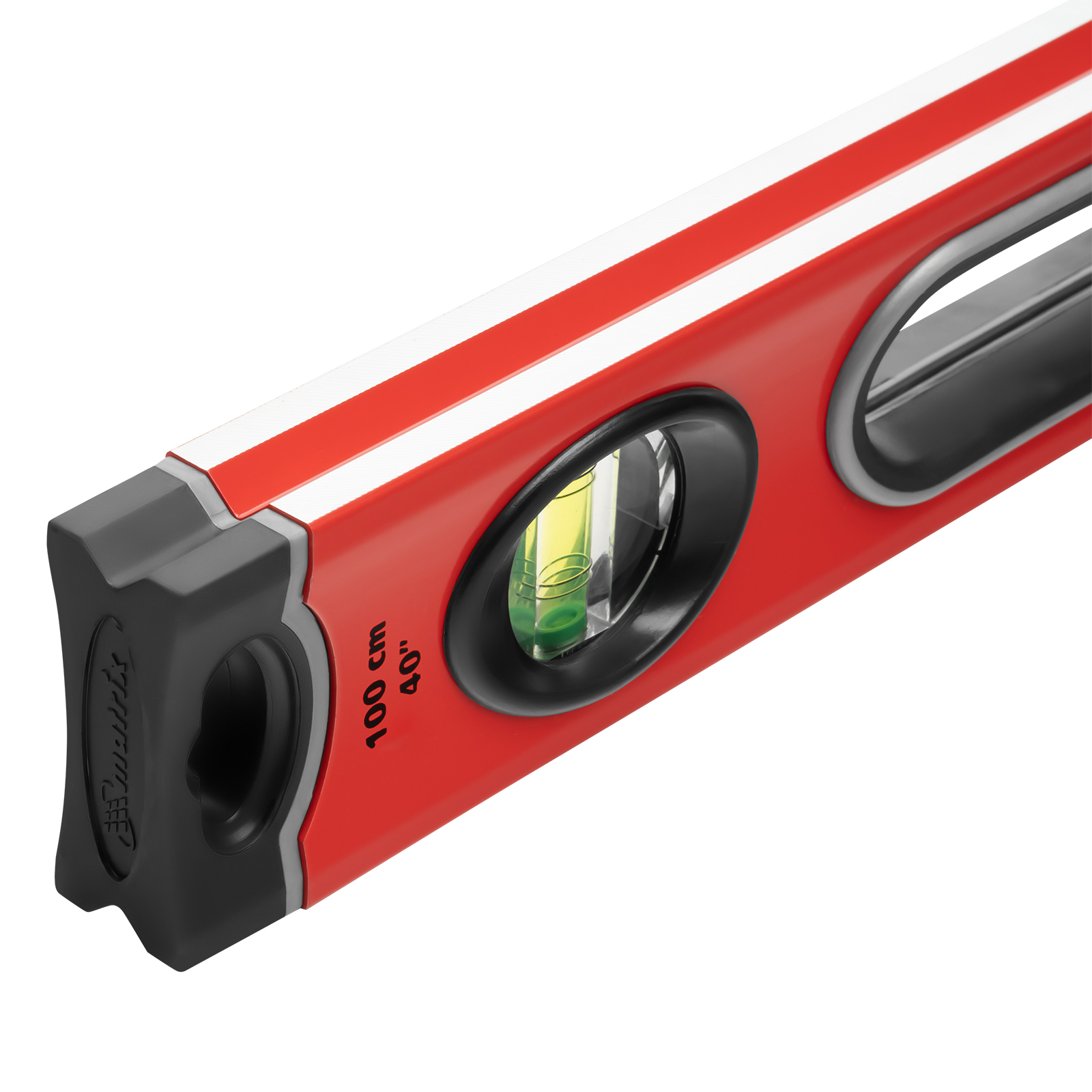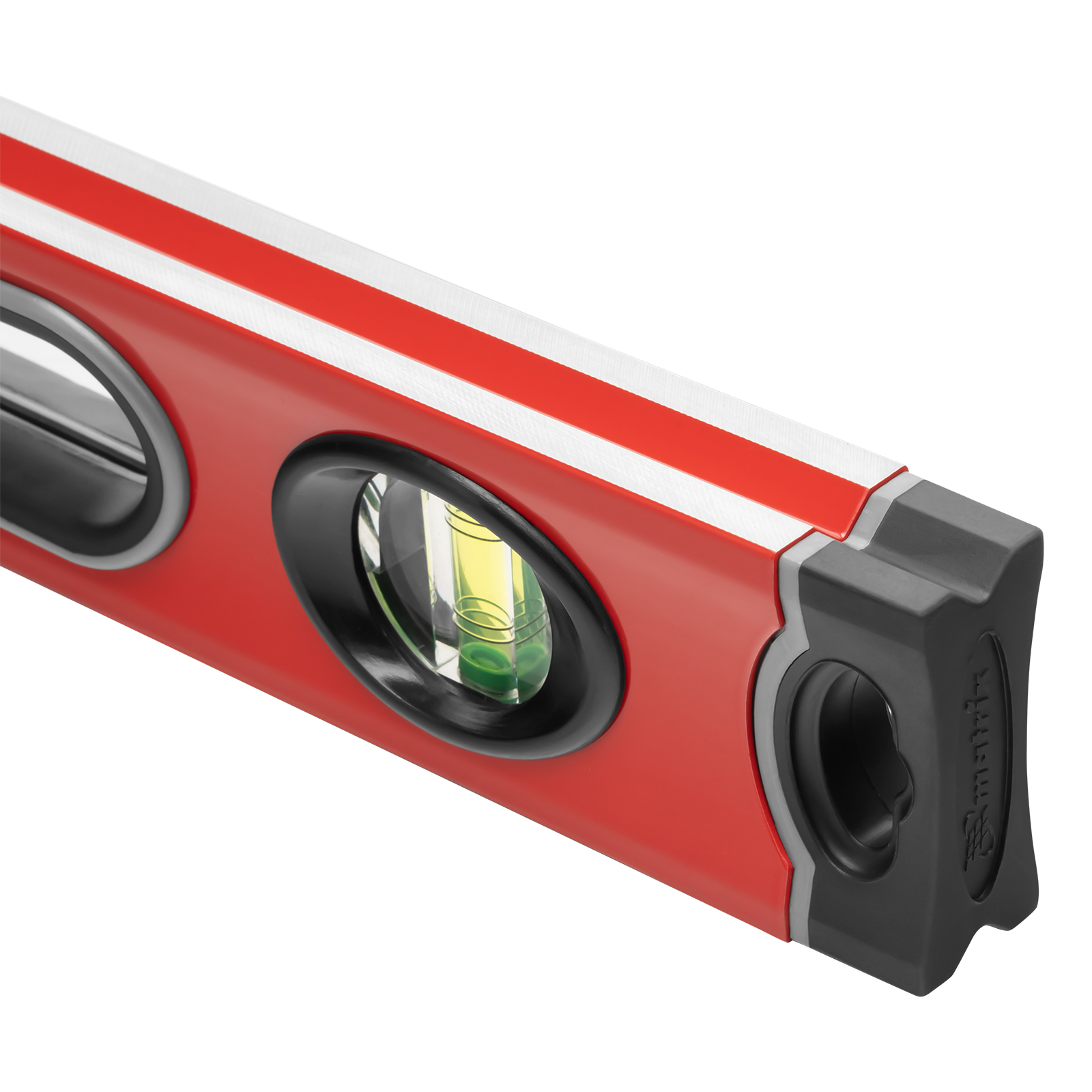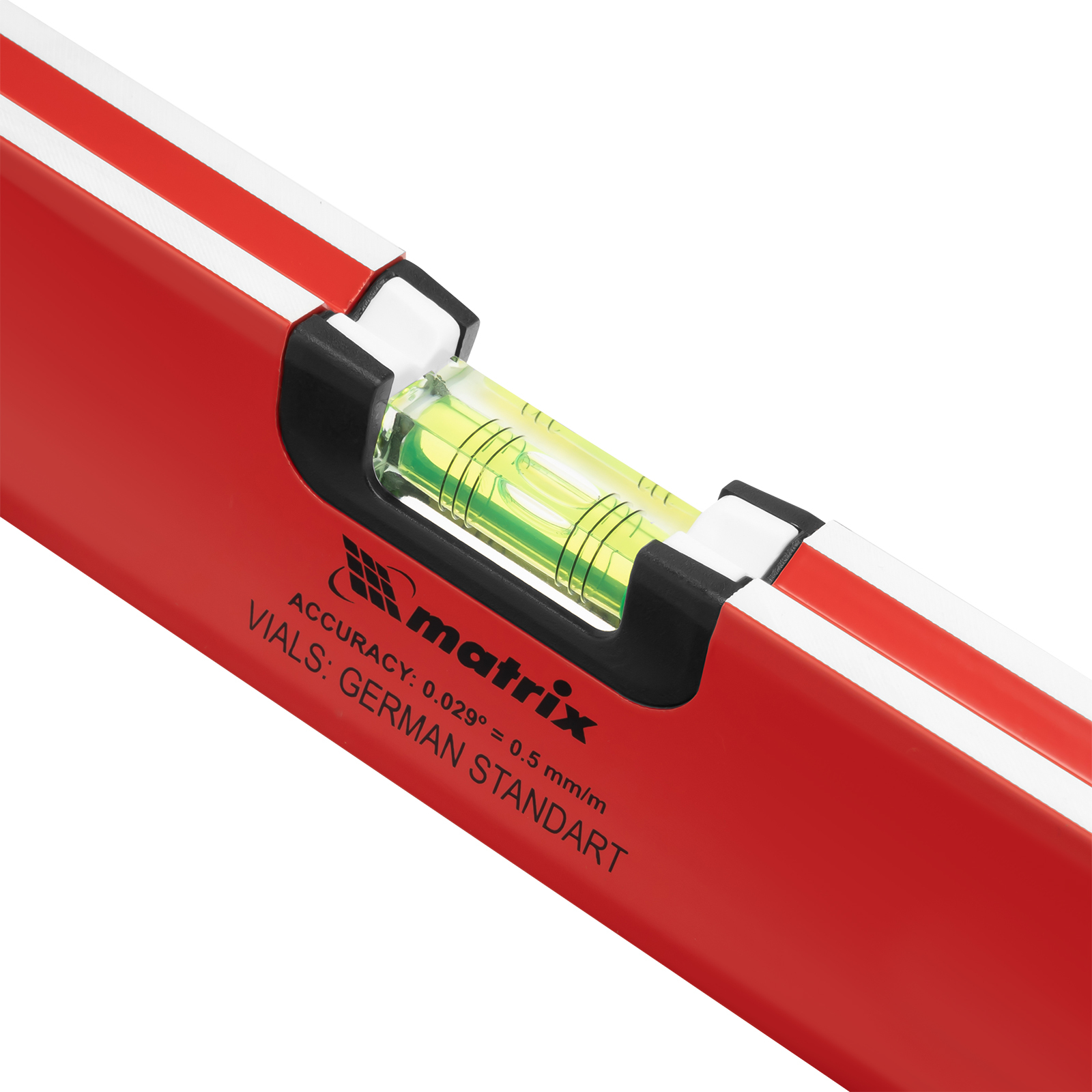 Алюминиевый уровень Matrix 34308 длиной 1000 мм, с 3 глазками, ударопрочными заглушками и двухкомпонентными ручками, повышает точность работы, т. к. позволяет обнаружить отклонения от вертикали, горизонтали и угла 45°. Используется для монтажа конструкций, укладки покрытий, облицовки поверхностей и т. д., подходит для профессионального и бытового применения.