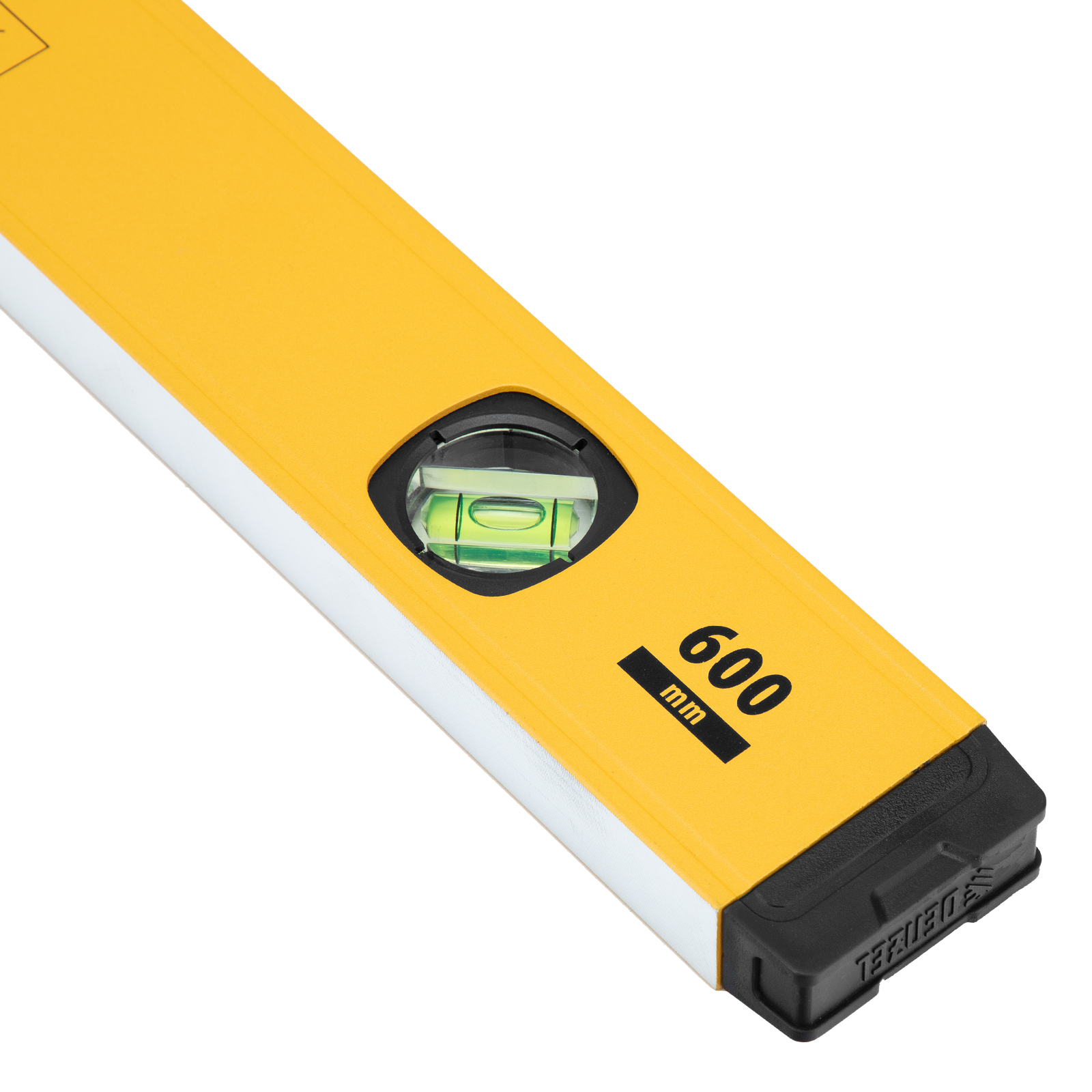 Алюминиевый фрезерованный уровень Denzel 33691 длиной 600 мм, с магнитом и 3 глазками, из которых 1 зеркальный, предназначен для контроля отклонений от горизонтальной, вертикальной и поверхности под углом 45° с точностью 0,5 мм/м. 3 пузырьковые камеры 90°, 180° и 45° позволяют быстро проверить правильность разметки. Инструмент незаменим при проведении строительных, ремонтных, сантехнических работ.