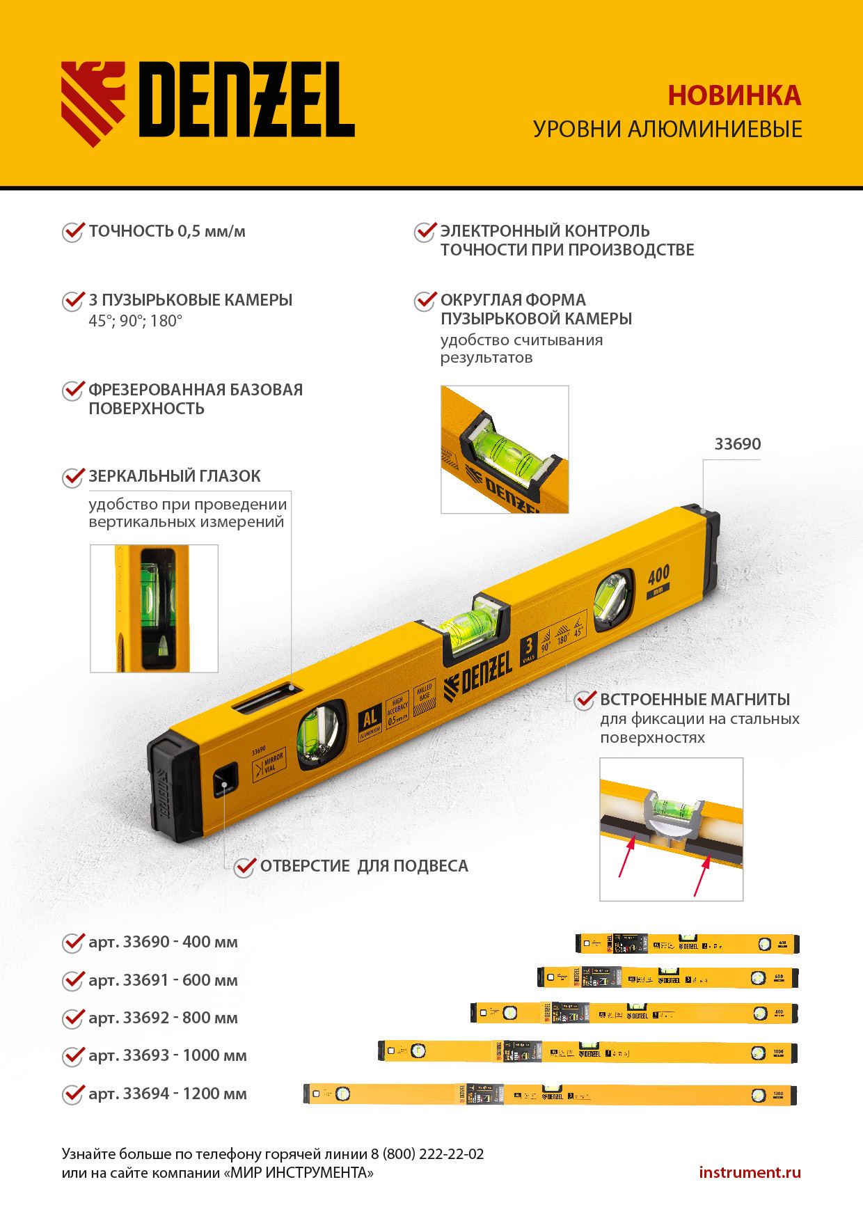 Уровень алюминиевый, магнит, фрезерованный, 3 глазка (1 зеркал.) 0,5 мм/м, 600 мм Denzel