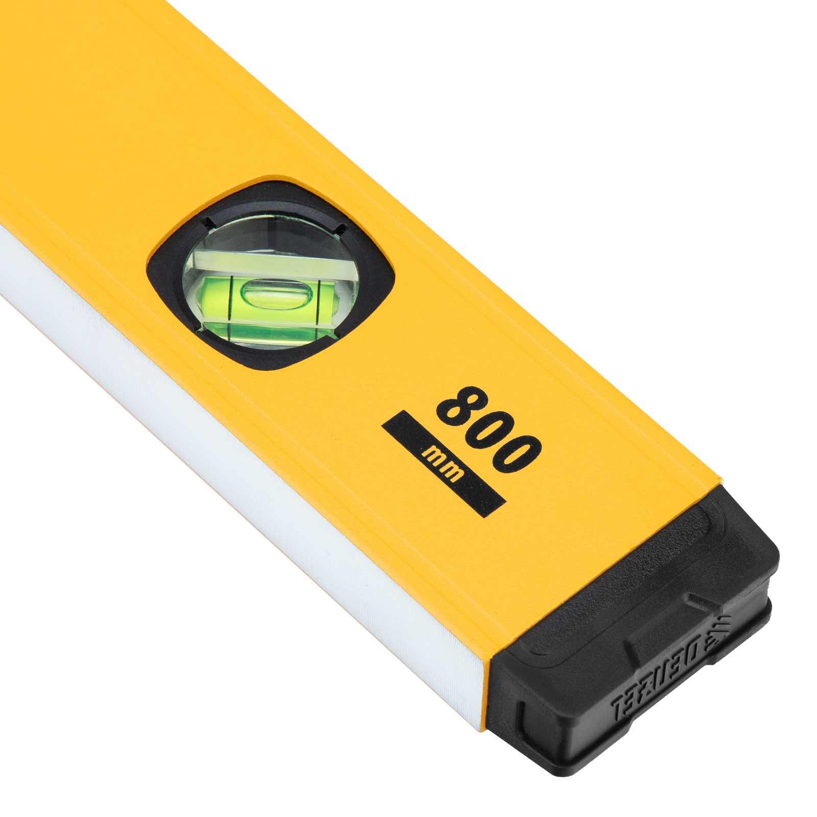 Алюминиевый фрезерованный уровень Denzel 33692 длиной 800 мм, с магнитом и 3 глазками, из которых 1 зеркальный, предназначен для контроля отклонений от горизонтальной, вертикальной и поверхности под углом 45° с точностью 0,5 мм/м. 3 пузырьковые камеры 90°, 180° и 45° позволяют быстро проверить правильность разметки. Инструмент незаменим при проведении строительных, ремонтных, сантехнических работ.