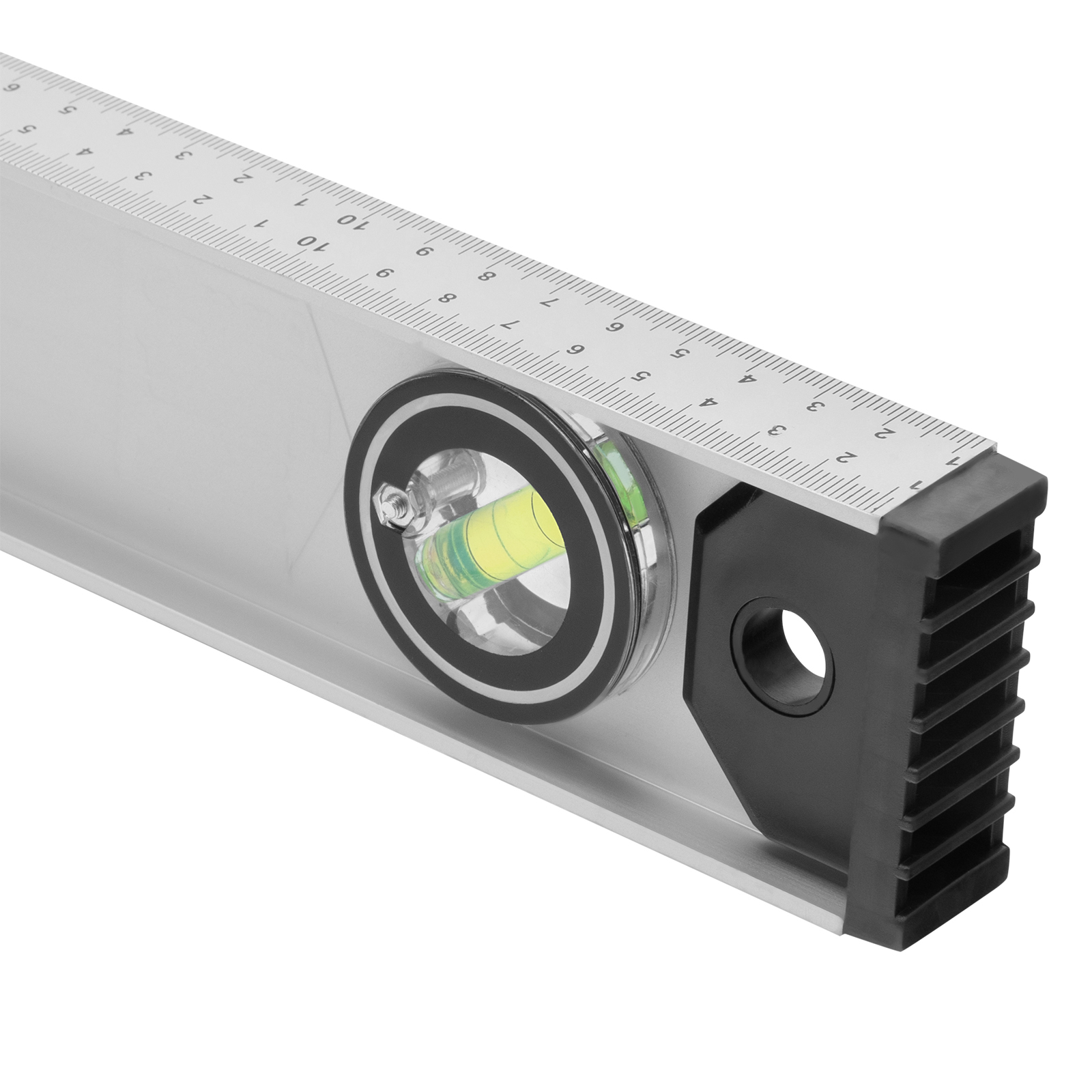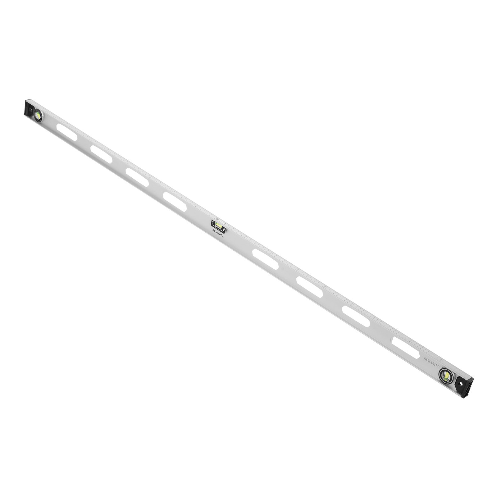Алюминиевый уровень Matrix «Рельс» 34038 длиной 1800 мм имеет 3 глазка: 2 для проверки отклонений от заданной вертикали и горизонтали и 1 поворотный для проверки наклонных поверхностей.