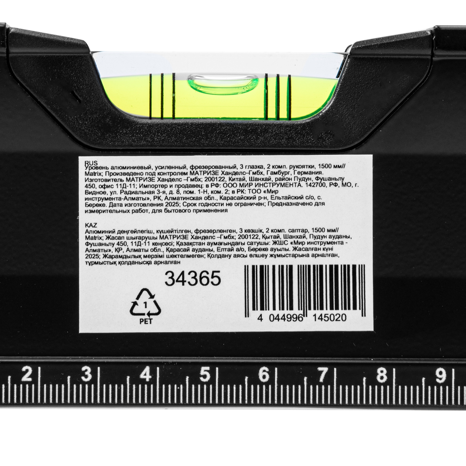 Уровень алюминиевый, усиленный, фрезерованный, 3 глазка, двухкомпонентные рукоятки, 1500 мм Matrix