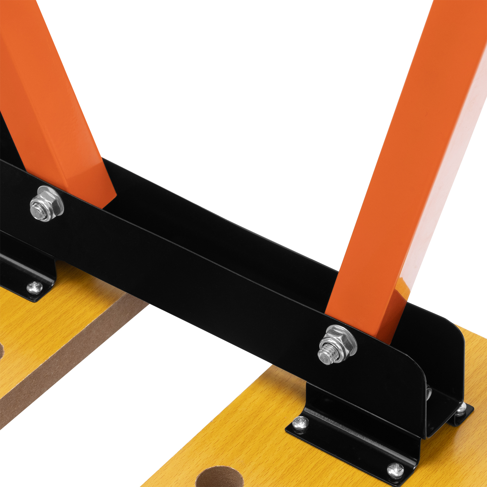 - Удобная эксплуатация — верстак снабжен 4 съемными упорами, которые устанавливаются в различных позициях, а на столешнице имеется разметка с линейкой и транспортиром.