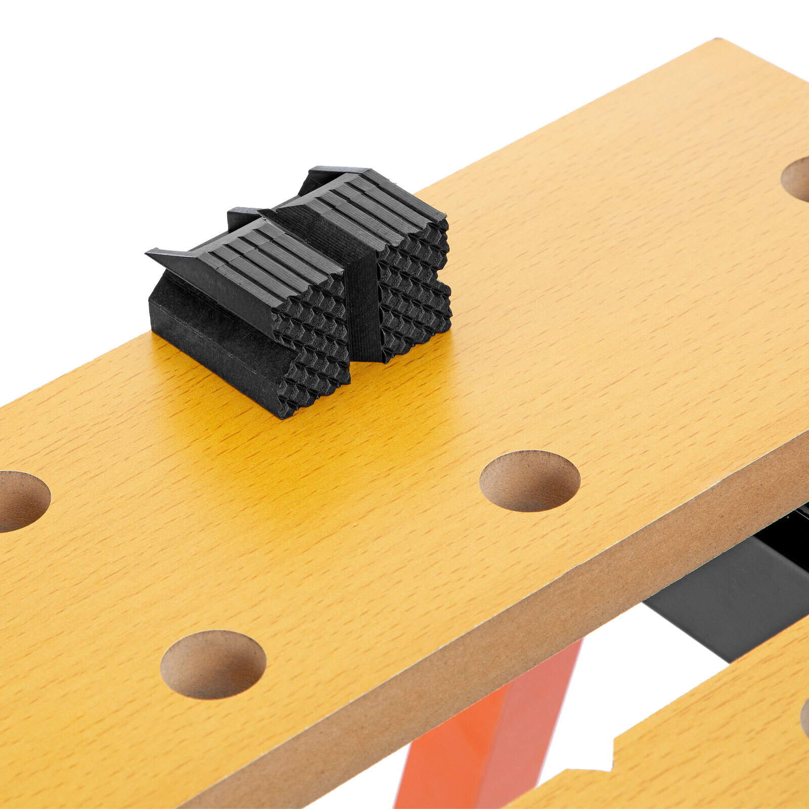- Удобная эксплуатация — верстак снабжен 4 съемными упорами, которые устанавливаются в различных позициях, а на столешнице имеется разметка с линейкой и транспортиром.