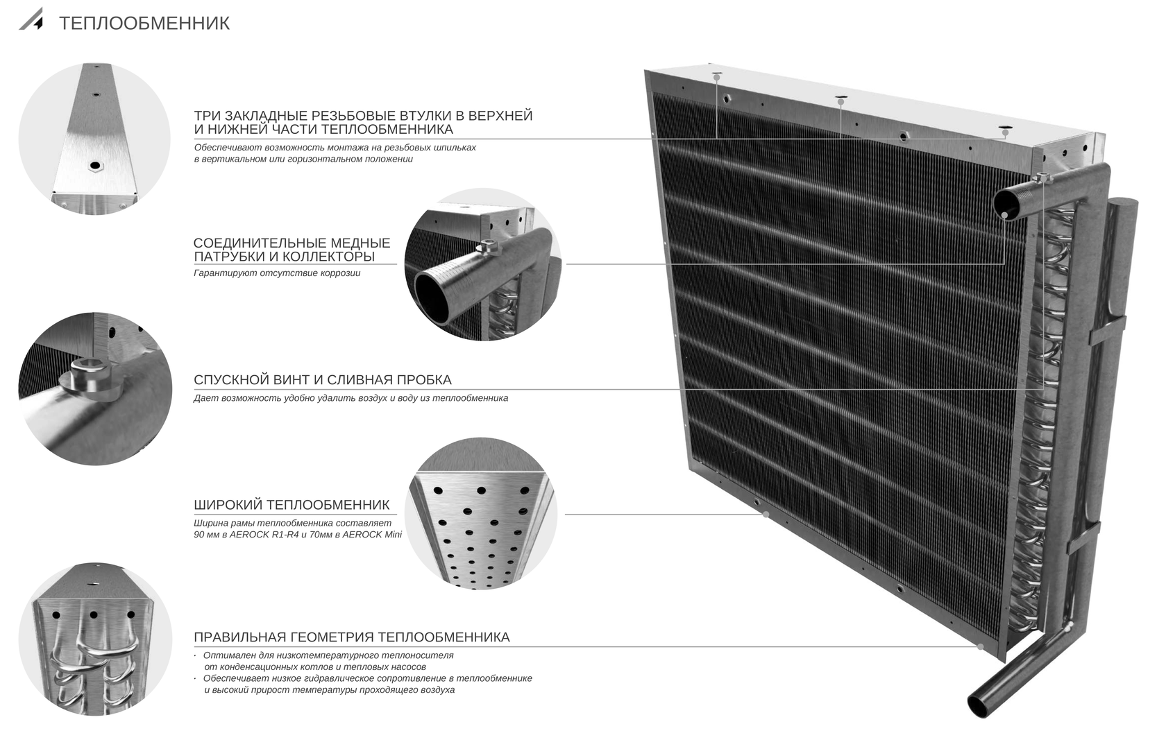 - Материалы для производства водяных тепловентиляторов AEROCK MINI R3 AC имеют высокую устойчивость к коррозии и агрессивным средам, что позволяет устанавливать его в различных помещениях.