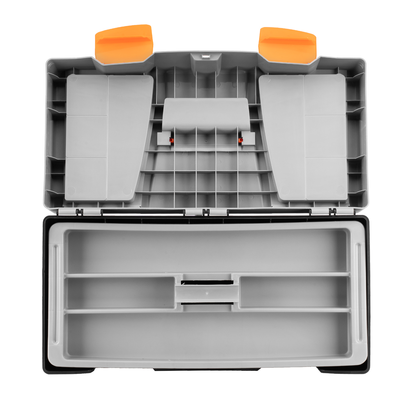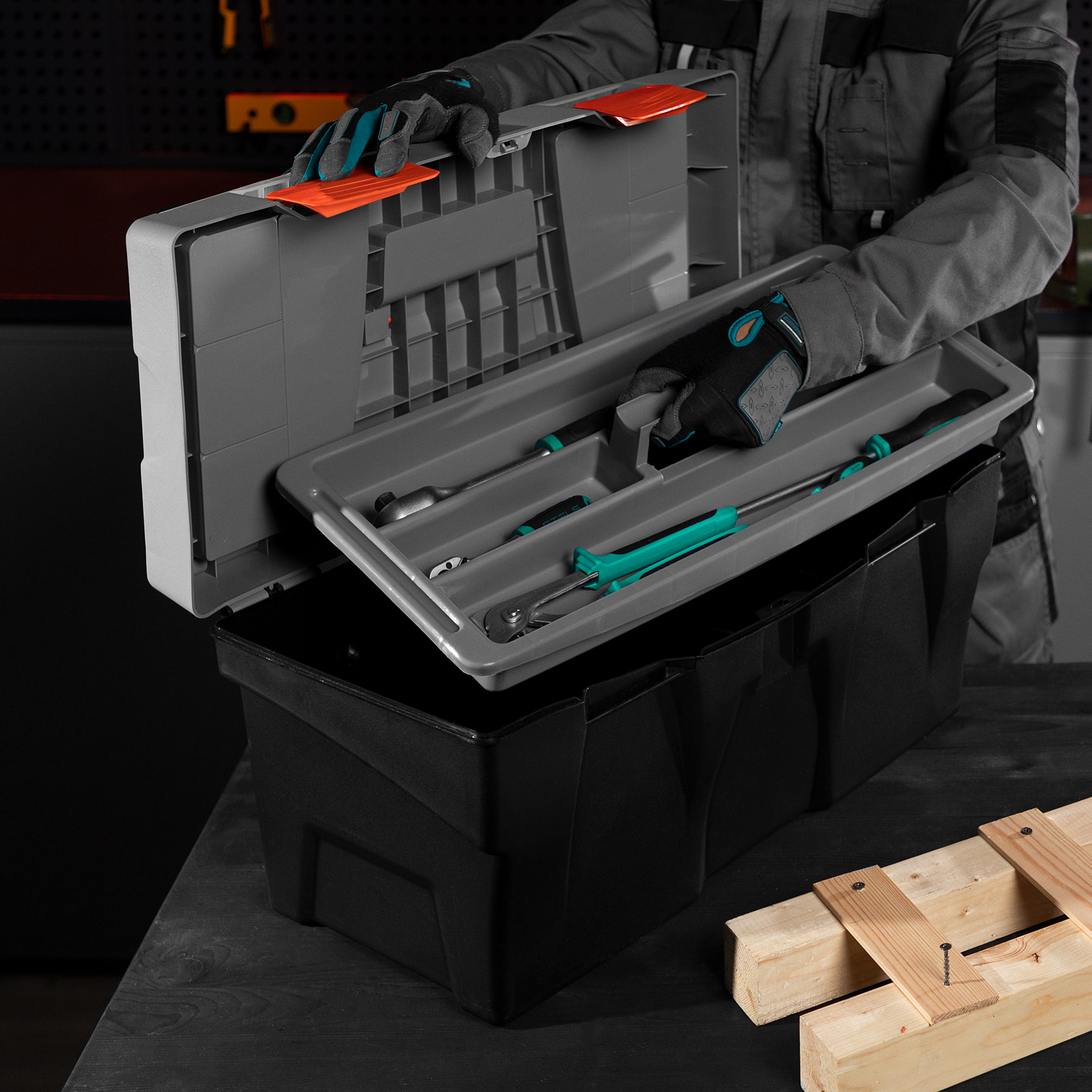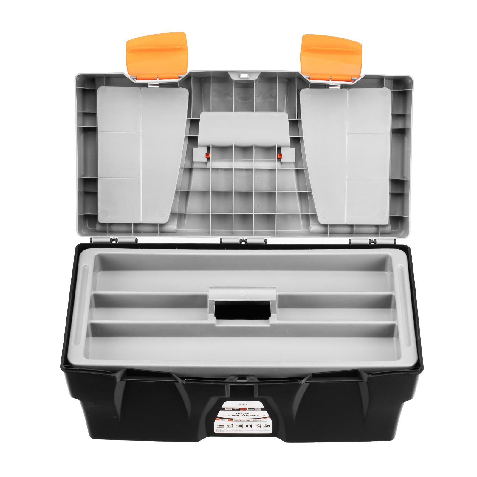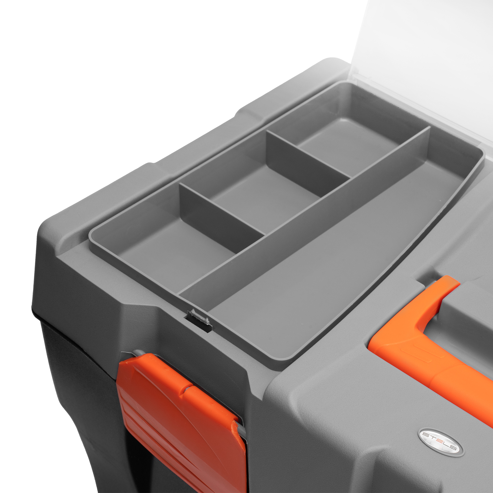 Ящик для инструмента Stels 90706, 23 дюймов, габаритами 590 х 300 х 300 мм, из пластика, предназначен для переноски и хранения инструментов, хозяйственных мелочей, рыболовных снастей. Содержимое не рассыпется, поскольку он надежно закрывается. Встроенные в крышку отделения обеспечивают быстрый доступ к крепежам и другим необходимым предметам. Большой ящик для хранения инструментов будет полезен дома, на даче, в гараже и на рыбалке.
