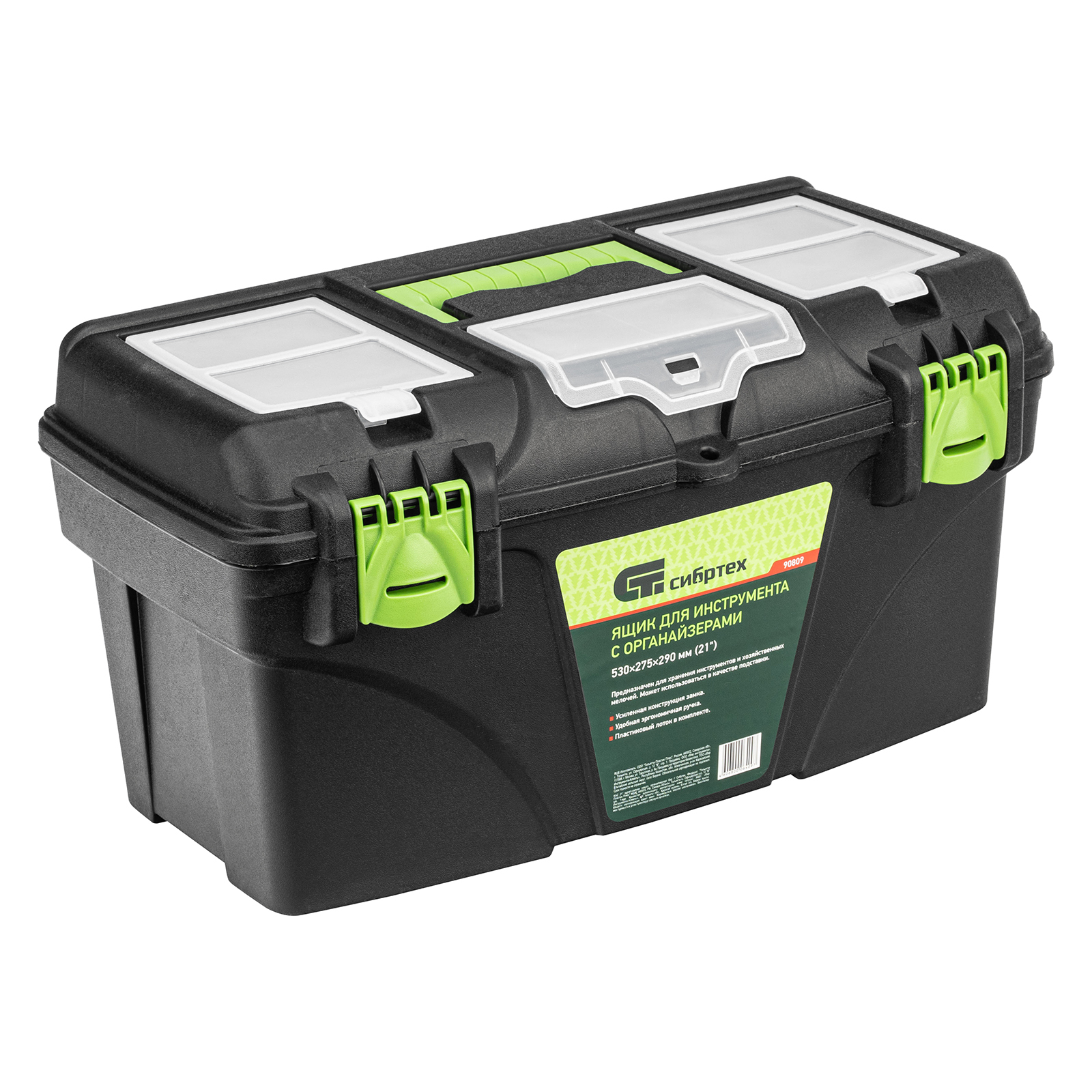 Ящик Сибртех 90809 длиной 21", с органайзерами, используется для хранения и транспортировки инструментов, оснастки, крепежа, хозяйственных мелочей и других предметов. Крышка и замок усилены трехрядными петлями, поэтому ящик выдерживает вес содержимого до 50 кг. Съемный лоток позволяет оптимизировать пространство внутри ящика. Его можно брать в поездку, также он пригодится дома, на даче или в гараже.